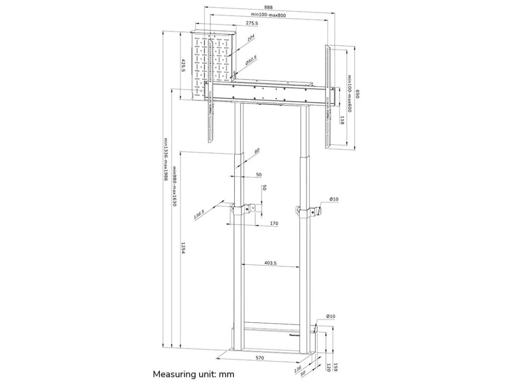 Rozměry VESA: 100 × 100, 100 × 150, 100 × 200, 120 × 120, 200 × 100, 200 × 200, 200 × 300, 200 × 400, 300 × 100, 300 × 200, 300 × 300, 350 × 350, 400 × 200, 400 × 300, 400 × 400, 400 × 500, 400 × 600, 440 × 400, 500 × 400, 600 × 200, 600 × 300, 600 × 400, 600 × 500, 600 × 600, 680 × 300, 800 × 200, 800 × 400, 800 × 500, 800 × 600 mm