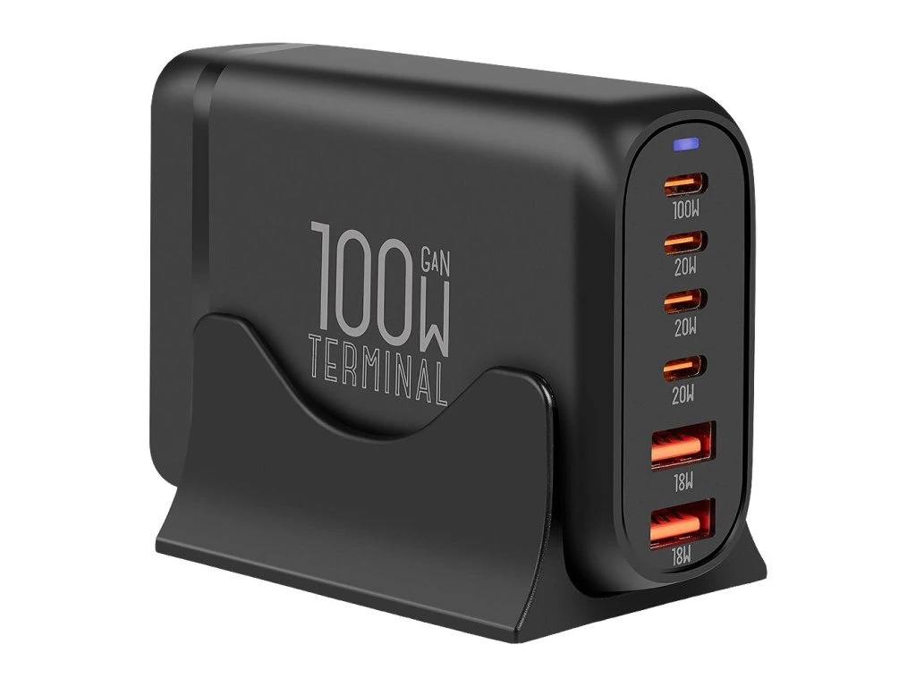 Síla 100 W, která zvládne všechno, co potřebujete. OBAL:ME Terminal je stolní nabíječka s technologií GaN3, která přináší výjimečný výkon, kompaktní rozměry a vysokou účinnost. Kombinuje čtyři porty USB-C a dva porty USB-A, čímž umožňuje nabíjet až šest zařízení současně s celkovým výkonem až 100 W.