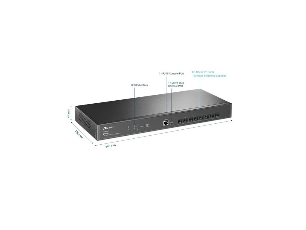Omada 8-Port 10GE SFP+ L2+ Managed Switch PORT: 8× 10G SFP+ Slots, RJ45/Micro-USB Console Port SPEC: 1U 19-inch Rack-mou
