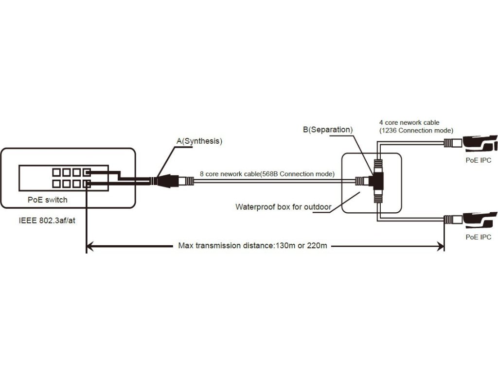 Slučovač na vstupu sloučí 2 kabely, zapojené například do PoE switche, přičemž z každého využije vždy 4 žíly. Splitter na konci pak signál opět rozdělí na dvě samostatné větve, které lze připojit k cílovým zařízením. Tento způsob přenosu je ideální například pro připojení dvou IP kamer v místech, kde je vedený pouze jeden kabel, ale je potřeba napájet a připojit více zařízení.