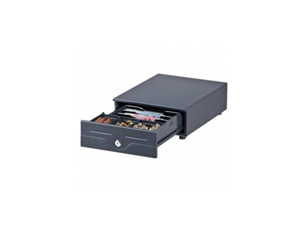 Pokladní černá zásuvka K-4 s plastovým čelním krytem a elektrickým otvíráním slouží k připojení k tiskárnám účtenek. Obsahuje horizontální přihrádky na bankovky, mincovní přihrádky a je vybavená třípolohovým zámkem.