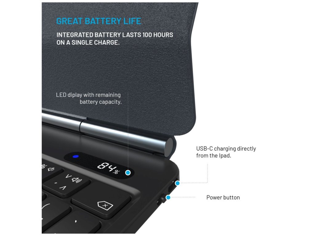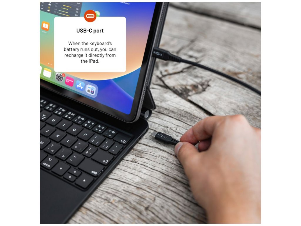 - USB-C port – dobíjení klávesnice přímo z iPadu