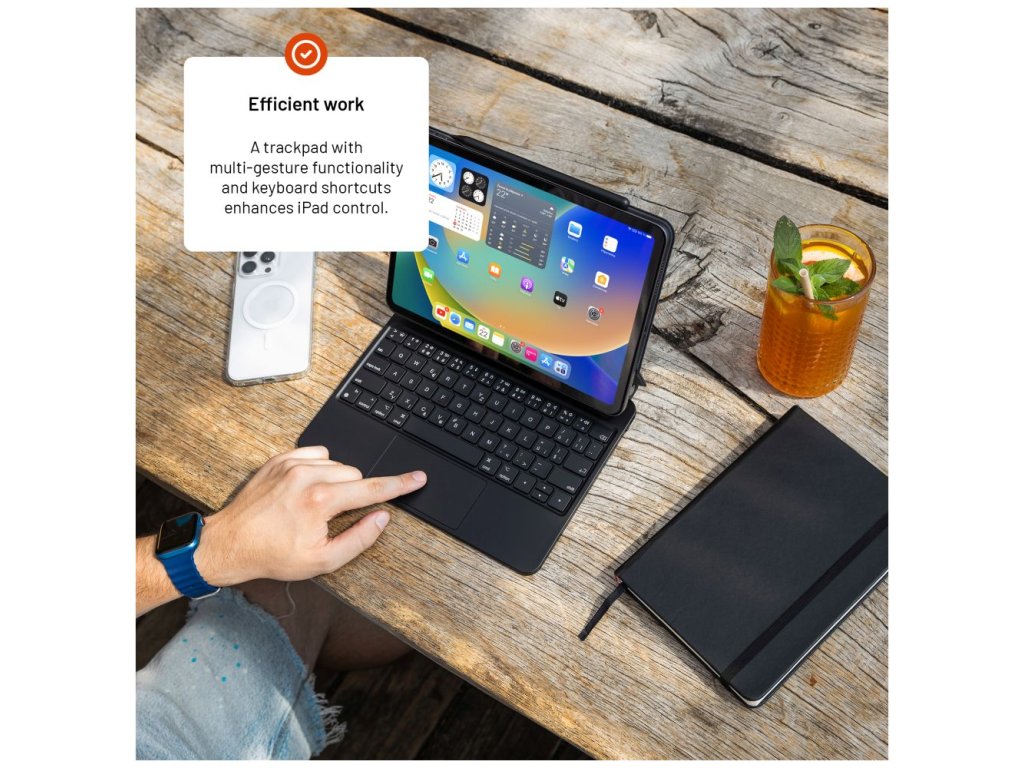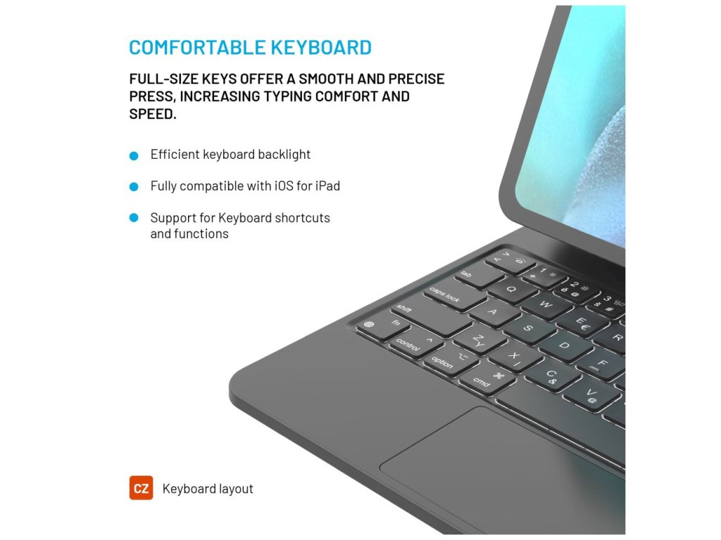 Pouzdro Typee od značky Fixed využijete pro svůj Apple iPad Pro 11" a iPad Air. Je vybavené podsvícenou bezdrátovou klávesnicí s českým layoutem, pětibodovým multidotykovým trackpadem a praktickými funkčními klávesami. Ty podporují specifická gesta a klávesové zkratky pro operační systém iPadOS. Na iPadu se vám tak bude pracovat stejně dobře jako na MacBooku. Baterie v klávesnici má výdrž až 100 hodin a dobijete ji pomocí USB-C kabelu přímo z iPadu.