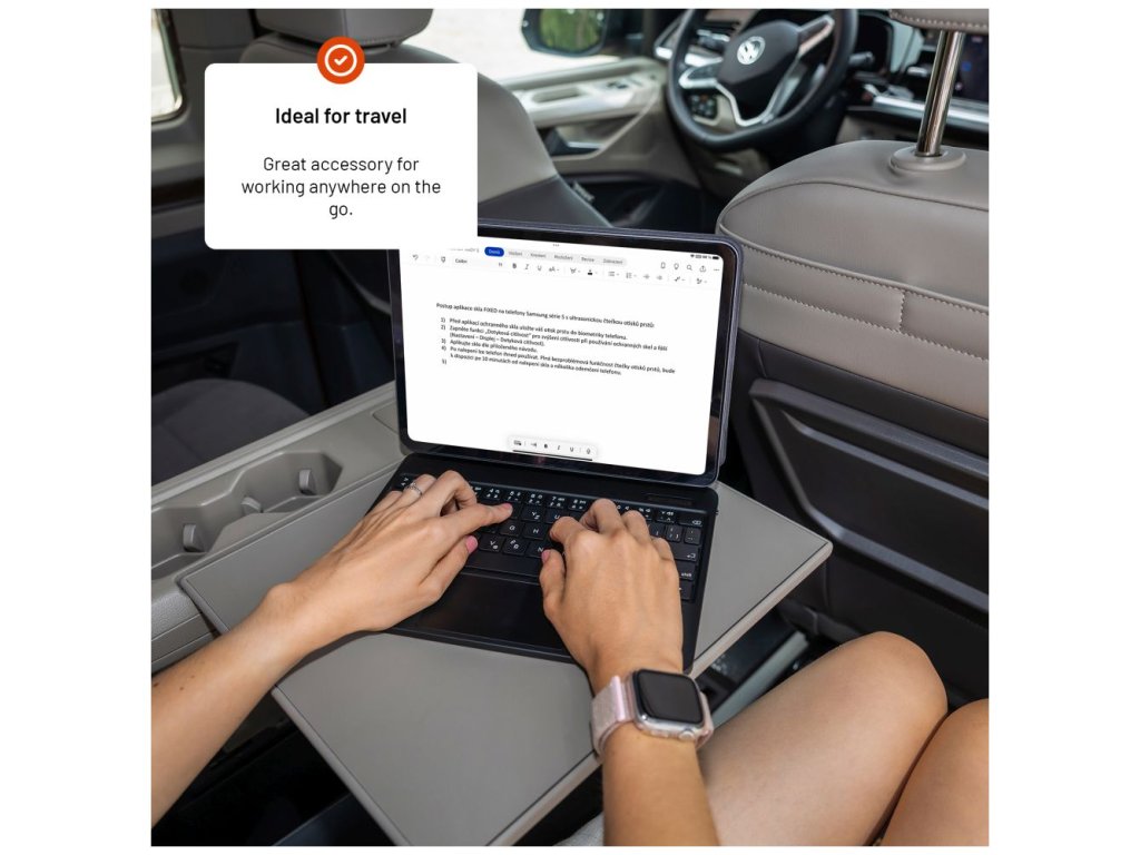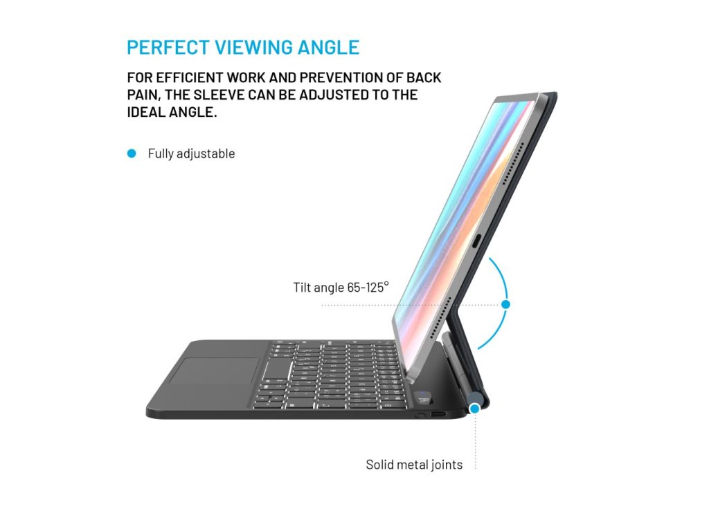 Svůj iPad na vnitřní stranu pouzdra jednoduše přichytíte pomocí magnetů, bude tak chráněný ze všech stran. S klávesnicí ho pohodlně propojíte pomocí Bluetooth. Velkou výhodou je možnost nastavení úhlu náklonu, a to od 65 ° do 125 °. Jistě oceníte také další šikovnou funkci – režim automatického uspání a probuzení (sleep and wake). Informace o stavu nabití si zobrazíte na LED displeji. Samozřejmostí je výřez pro fotoaparát v pouzdře.