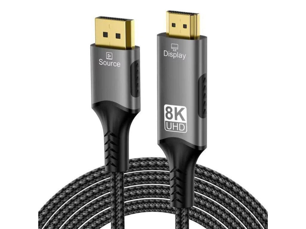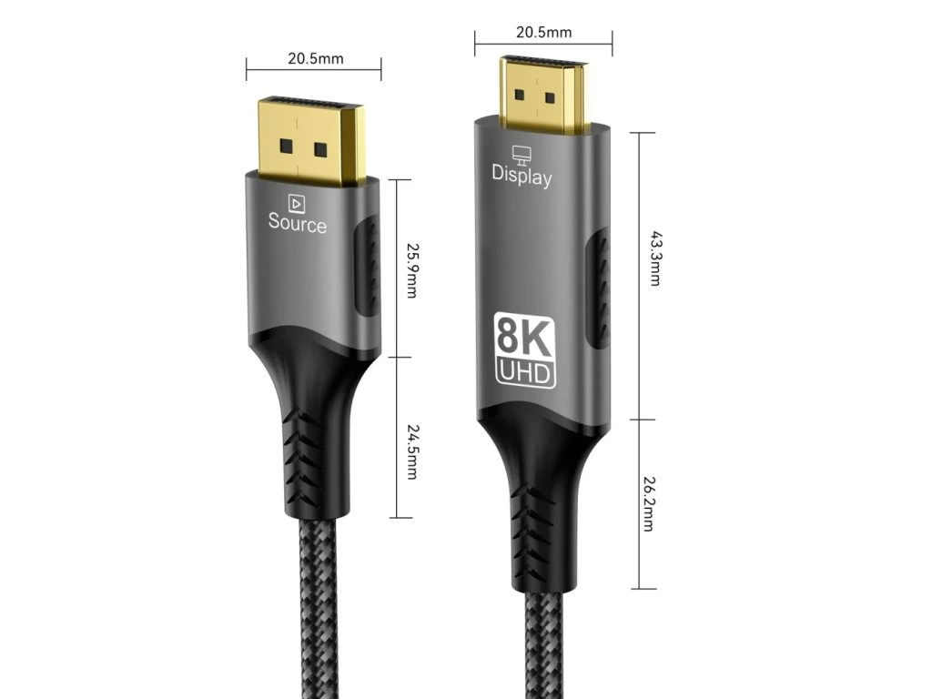 2160), 2K@165Hz/240Hz - Datový tok: 48Gbps - Podporuje 3D zobrazení, HDR, HDCP 1.4 a 2.2 - Quick Media Switching(QMS),Auto Low Latency Mode(ALLM), Quick Frame Transport(QFT) - Zvuk: 1536kHz audio sample - Chipset: VMM7100 - Napájení ze sběrnice, není potřeba externí napájení - Plug & Play, podpora výměny za provozu - Kovové šedivé pouzdro konektorů - Pozlacené konektory - Příjemně měkký kabel s bavlněným opletením - Stříbrno šedá barva kabelu a opletení - Délka: 2m. Kabel DisplayPort - HDMI funguje jednosměrně, kabel uvnitř obsahuje elektronický převodník DP -> HDMI, který dokáže konvertovat signál pouze ve směru DP -> HDMI. Zapojujte kabel vždy tak, aby zdroj video signálu byl konektor DisplayPort a na zobrazovači, TV nebo monitoru byl konektor HDMI.