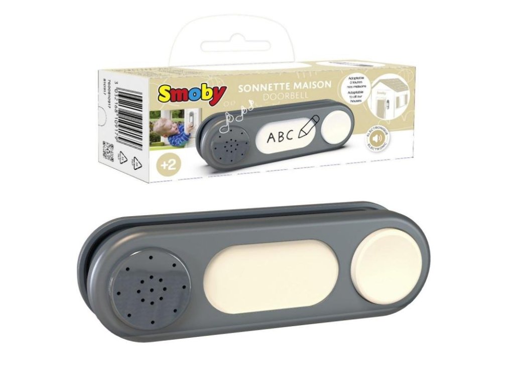 Máte doma dětský zahradní domek Smoby? Pořiďte k němu plastový elektronický zvonek, který náhodně přehrává 3 různé zvuky. Vaše děti se tak mohou těšit na zvuk klasického zvonku, štěkot psa a mňoukání kočky. Je kompatibilní s modely Pretty, Nature, Neo Jura Lodge, My Neo House a dalšími rozšiřitelnými domečky značky Smoby. Napájíte ho pomocí svou AAA baterií (nejsou součástí balení). Hračka je vhodná pro děti od 3 let.