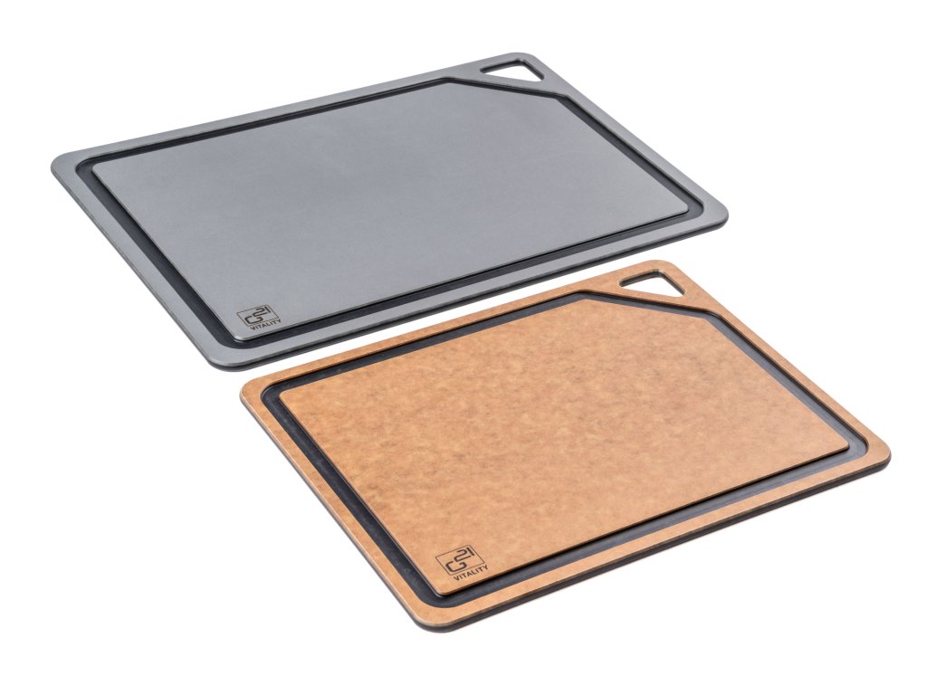 Univerzální prkénka EcoCut z biologicky rozložitelné celulózy spojují odolnost, šetrnost k ostří a moderní design. Snadno odolají i horkým hrncům, takže je můžete použít i jako podložku pod horké nádobí. Díky protiskluzové úpravě se prkénka při práci ani nehnou, zůstávají vždy pevně na místě. Praktická drážka po obvodu zachytí šťávy z masa i jiné tekutiny, díky tomu zůstane kuchyňská linka po krájení bez poskvrnky. V balení najdete rovnou 2 velikosti prkének (30 × 23,5 cm a 37 × 27,4 cm), které si zamilujete při přípravě masa, zeleniny, ovoce i bylinek.