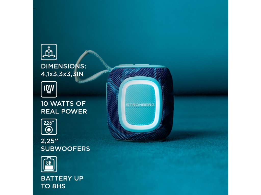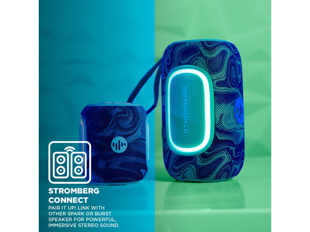 S hmotností pouze 440 g a rozměry 85 × 105 × 85 mm se Stromberg SPARK vejde do každího batohu. Jeho robustní tělo s IPX5 odolností z něj dělá spolehlivého společníka pro venkovní dobrodružství. LED podsvícení zajistí vizuální efekt a funkce True Wireless Stereo umožní propojení s dalším reproduktorem pro větší zvukový prostor.