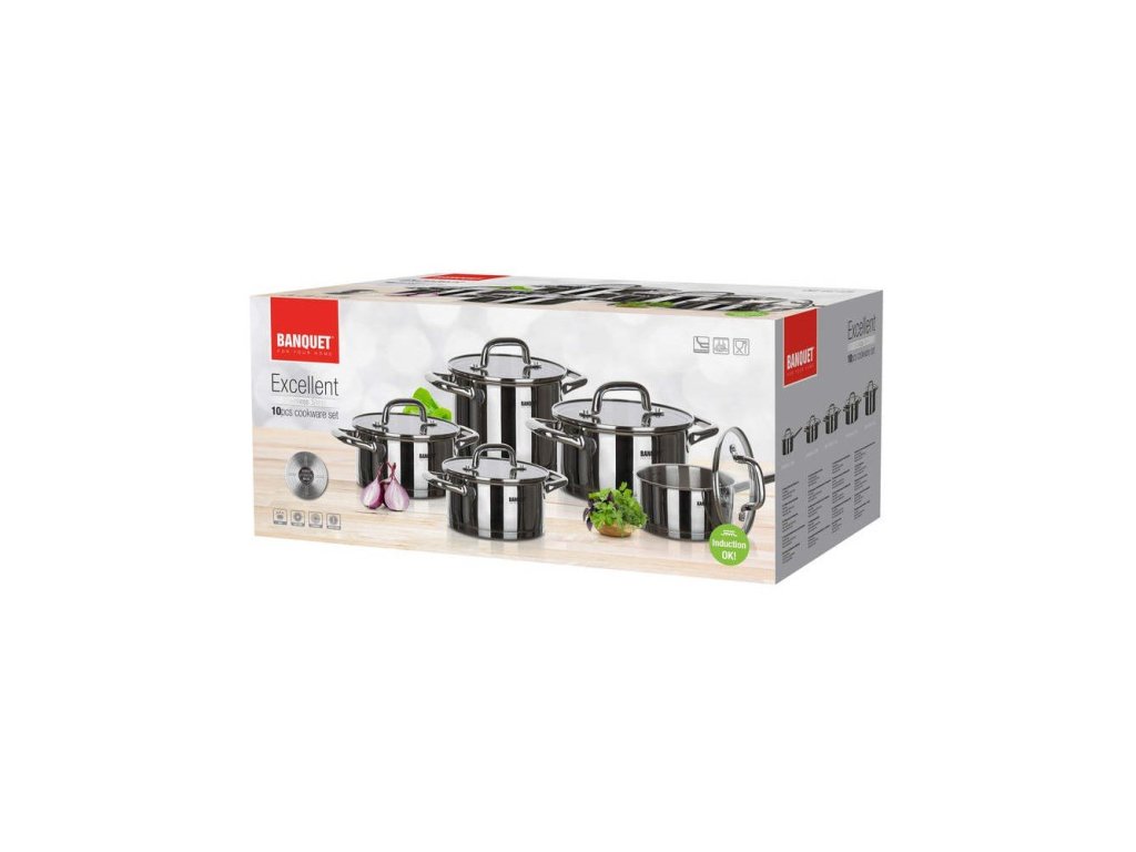 Trávíte u sporáku mnoho času a je to na vašich hrncích znát? Pořiďte si 10dílnou sadu nerezového nádobí Excellent od značky Banquet. V sadě najdete 4 hrnce o objemech 2,3 l, 3,1 l, 5,4 l a 6,4 l. Rendlík má objem 1,6 l. Nádoby mají vnější i vnitřní lesklou úpravou povrchu, uvnitř hrnců je navíc praktická měrka. Ke všemu nádobí máte k dispozici také poklice z odolného skla a s otvory pro unikající páru. Sadu můžete bez obav použít na všechny druhy ohřevu.