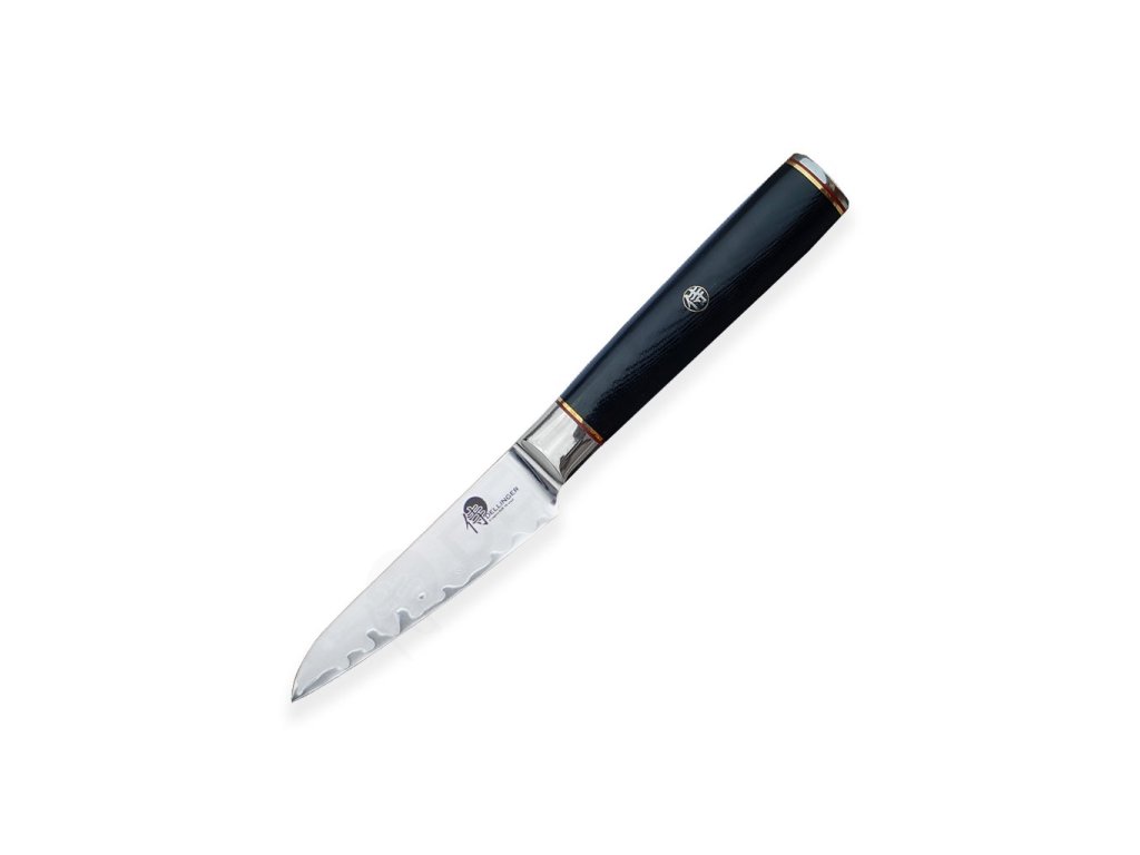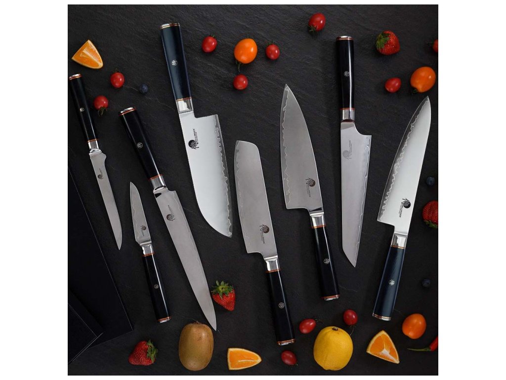 Sada Dellinger Okami vznikla pro ty, kdo hledají maximální kontrolu, ostrost a odolnost. Jádro z japonské oceli AUS-10 je vložené mezi dvě vrstvy nerezové oceli, čímž vzniká robustní a zároveň flexibilní čepel. Povrchová úprava typu stonewashed skrývá jemné škrábance a působí elegantně. Nože jsou broušené v úhlu 15°, díky čemuž snadno krájí i jemné suroviny bez deformace. Rukojeti z materiálu G-10 jsou ergonomické, pevné a ozdobené stylovým mozaikovým nýtem se samurajským znakem.