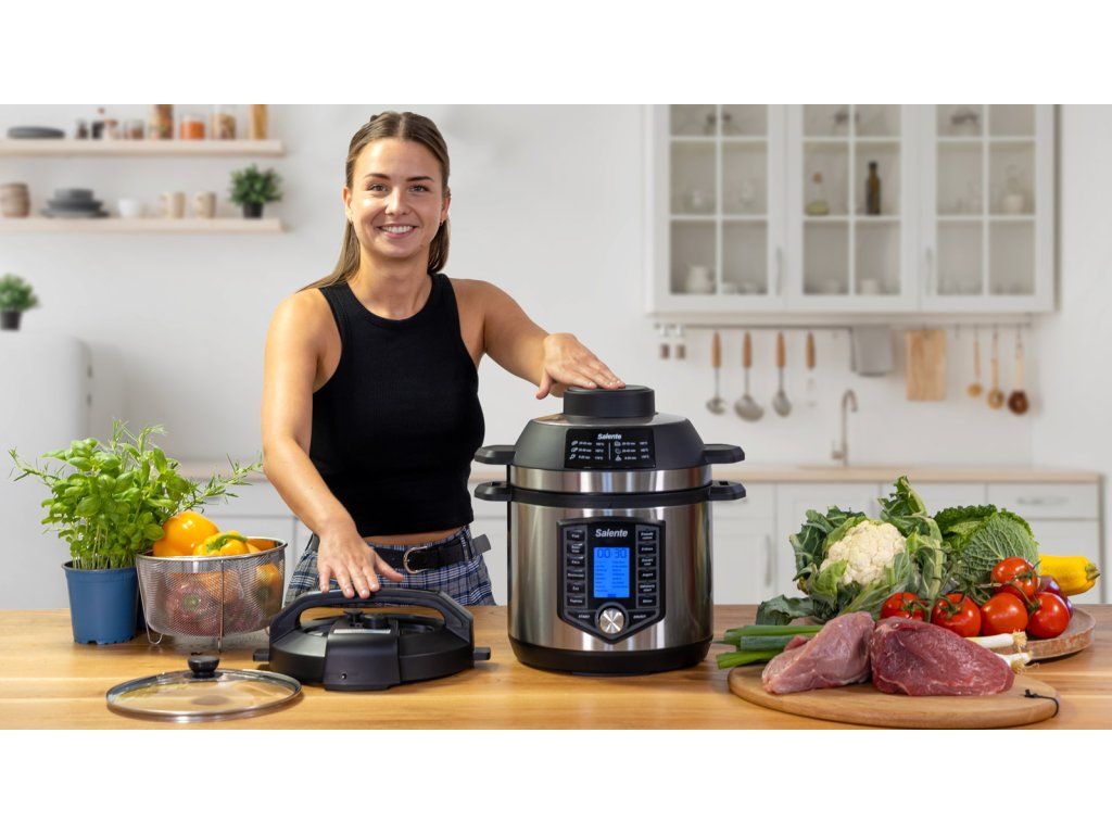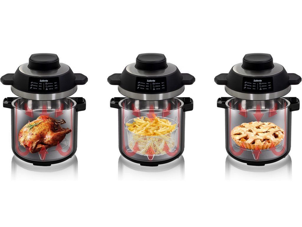 Horkovzdušná trouba, která je součástí balení, peče shora. Díky hornímu ohřevu dokážete připravit například menší kuře s křupavou kůžičkou, hranolky nebo koláč. Horkovzdušnou troubu můžete použít i jako doplněk po takovém vaření třeba jen k zapečení jídla.Vaření v tlaku