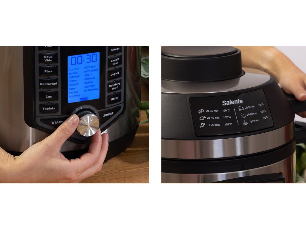 Ovládací panel hrnce i horkovzdušné trouby jsou v českém jazyce a jsou jednoduché a intuitivní. Mimo nadefinované programy je možné použit vlastní nastavení pro tlak a čas přípravy jídla. U horkovzdušné trouby je možné nastavit i teplotu.Nádoba na přílohy ušetří za rok 1 500 Kč