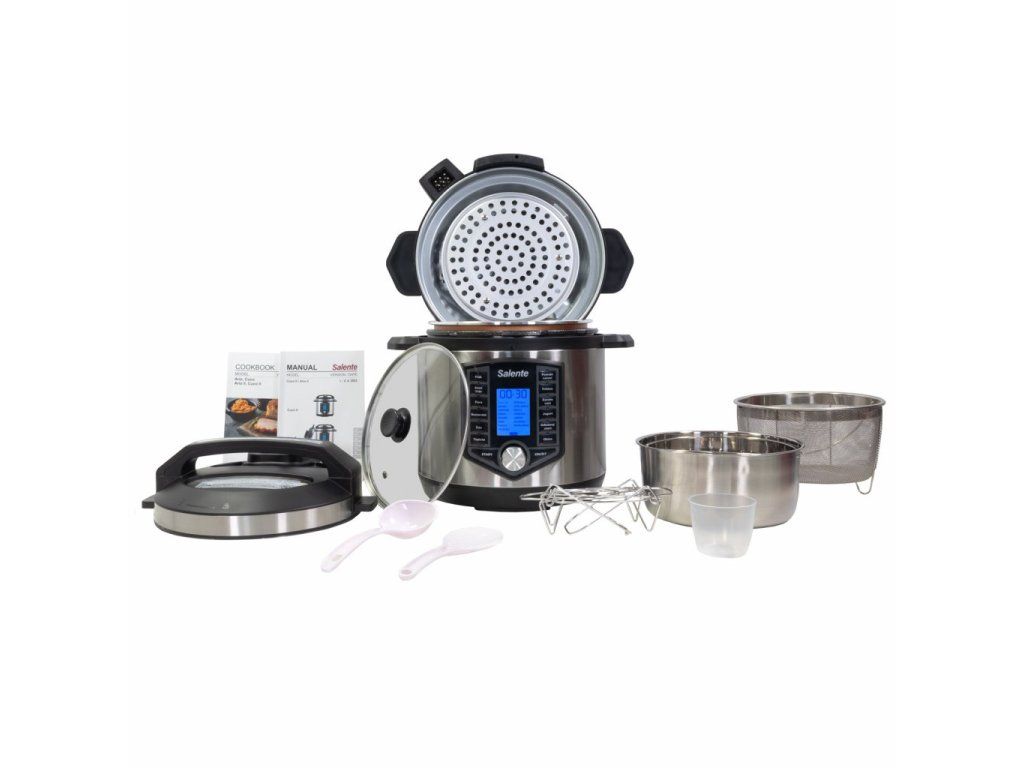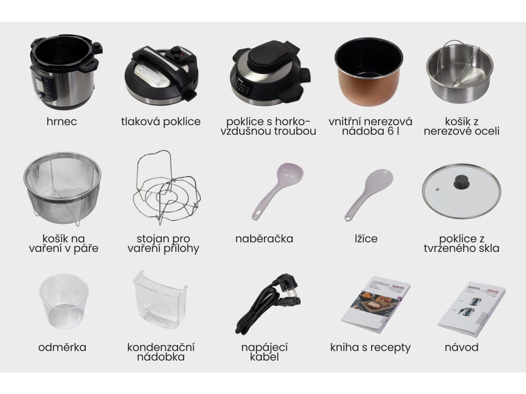 • Hrnec • Tlaková poklice • Poklice s horko-vzdušnou troubou • Vnitřní teflonová nádoba 6L • Nerezová nádoba na přílohy • Košík z nerezové oceli na fritování / vaření v páře • Stojan pro vaření přílohy • Naběračka • Lžíce • Poklice z tvrzeného skla • Odměrka • Kondenzační nádobka • Napájecí kabel • Kuchařka návod • NávodPřijímáme platby v Bitcoinu (⚡ Lightning Network)