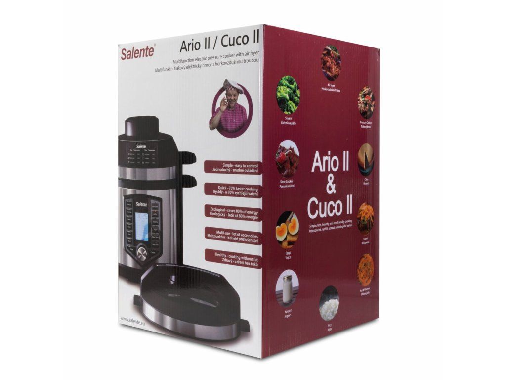 Po úspěšné verzi multifunkčního hrnce Ario a Ario+ přichází další verze s typovým označení Ario II. Nová verze se liší od předchůdce Ario+ zejména těmito vlastnostmi: • Cuco II (bez horkovzdušné trouby Friteo II) je kompatibilní s Ario II, dokoupením fritézy Friteo II ke Cuco II vznikne produkt Ario II • Ario II má plynulou volbu teploty pro tlakové vaření, sous-vide, restování a pomalé vaření • Ario II má 63 programů, Ario+ jen 32 (navíc je např. program sous-vide, zavařování a sušení) • Ario II má na tlakové poklici tlačítko pro vypouštění páry • Ario II modernější design • vnitřní nádobu Ario II o objemu 6L nelze použít pro Ario+Čtyři režimy vaření