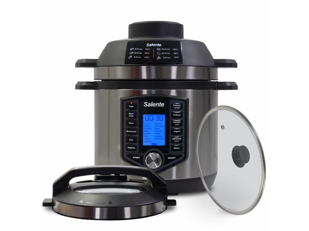 Režimy vaření se liší podle použití jednotlivých pokliček a programů. Balení multifunkčního hrnce Salente Ario II obsahuje tři poklice: horkovzdušnou troubu, poklici pro tlakové vaření a skleněnou poklici pro restování.Horkovzdušná trouba