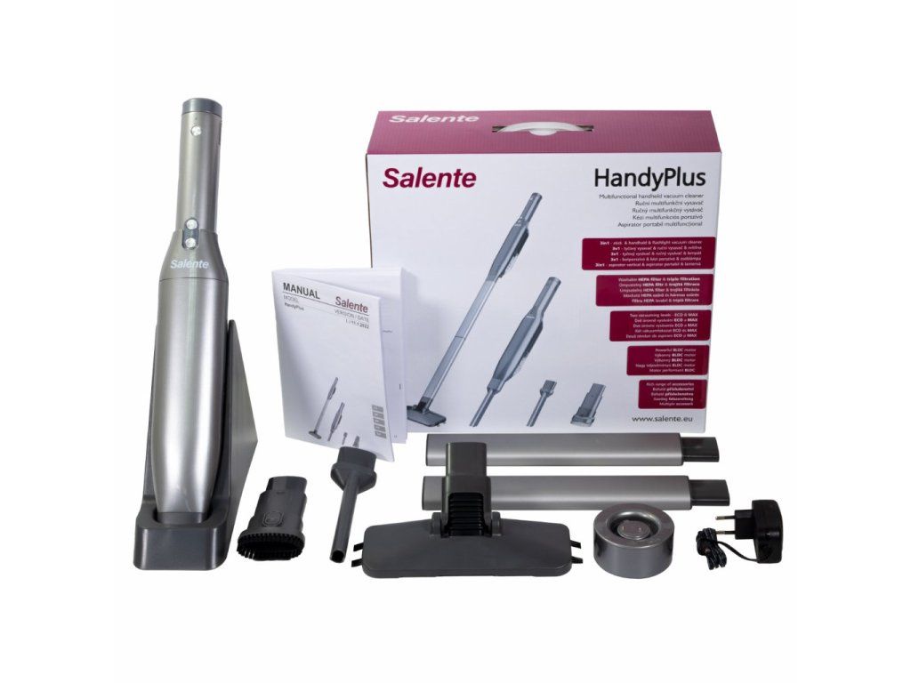 Salente HandyPlus je dodáván s praktickým stojánkem, štěrbinovou hubicí a hubicí 2v1. Hubici 2v1 můžete využít jako samostatnou štěrbinovou hubici na úklid špatně přístupných míst nebo vysunutím prachového kartáčku odstranit šetrně prach ze žaluzií, knih nebo klávesnice.SPECIFIKACE: