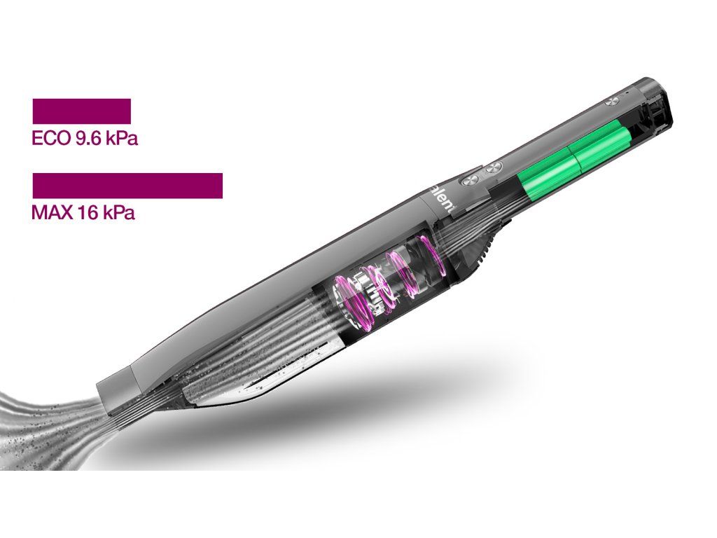 Vysavač Salente HandyPlus disponuje vysokým sacím výkonem, který v případě režimu ECO nabízí 9,6 kPa a v režimu MAX dokonce 16 kPa. Snadno tak vysajete všechny nečistoty ve vaší domácnosti nebo kanceláři. S kvalitní Li-Ion baterií 21,6 V s kapacitou 2000 mAh zvládnete uklízet až 45 minut v režimu ECO a až 21 minut ve výkonném režimu MAX.Výkonný a úsporný BLDC motor