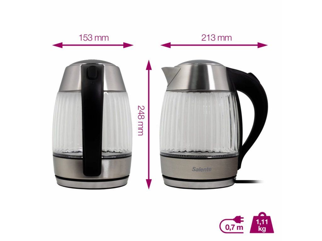 1) Modré u modelu StripeGlass-BL 2) Červené u modelu StripeGlass-RD • Anti-Calc filtr proti vápenatým usazeninám a nečistotám • Oboustranný ukazatel vodní hladiny s ryskami 0,5/1/1,8 litru • Tlačítko na víku s bezpečnostní pojistkou pro otevření/zavření • Středový 360° konektor s životností 10 milionů zdvihů • Možnost úpravy délky přívodního kabelu smotáním do podstavce • AntiDrip nerezová výlevka s designem pro eliminaci odkapávání • Topné dno z nerezové oceli • Skrytá topná spirála pod dnem konvice • Automatické vypnutí po dosažení bodu varu • Gumové protiskluzové nožičky základny • Tepelně odizolovaná rukojeť • Ochrana proti zapnutí bez vody • Tepelná pojistka proti přehřátí • Evropské certifikace LVD, EMC, RoHS • LFGB certifikace pro nezávadný styk s potravinami • Jmenovitý příkon: 1850-2200 W • Jmenovité napětí: AC 220-240 V • Jmenovitý kmitočet: 50/60 Hz • Délka přívodního kabelu: 0,7 m • Rozměry bez podstavce (š × h × v): 21,3 × 15,3 × 23 cm • Rozměry s podstavcem (š × h × v): 21,3 × 15,3 × 24,8 cm • Hmotnost bez podstavce: 0,91 kg • Hmotnost s podstavcem: 1,11 kg