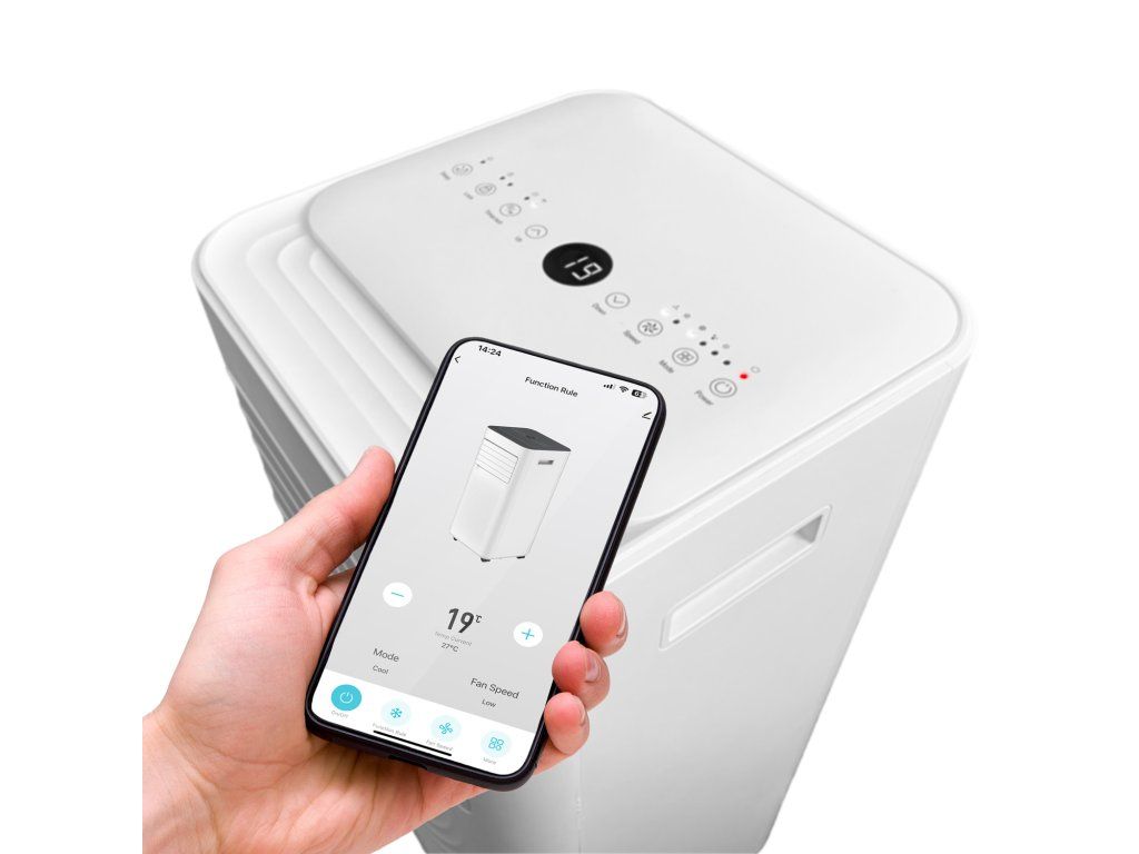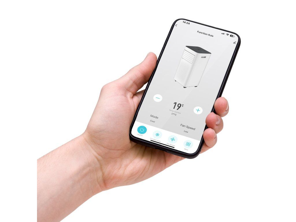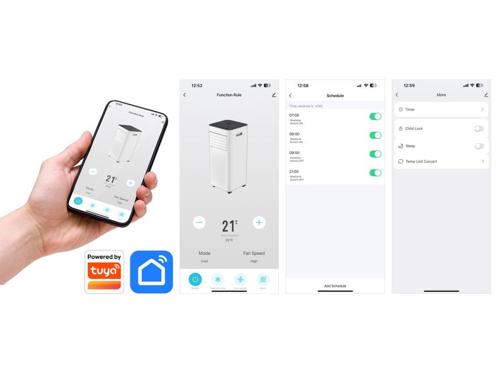 Klimatizaci je možné propojit s mobilním telefonem díky bezplatné aplikaci Tuya SmartLife, která je ke stažení jak pro mobilní telefony iPhone, tak pro všechny mobilní telefony se systémem Android. Vybrat si můžete ze dvou způsobů připojení – WiFi nebo Bluetooth.Mobilní aplikace nabízí tyto možnosti ovládání a přehledů: