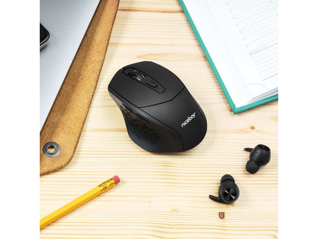 Niceboy M10 je stylová bezdrátová myš pro každodenní využití. Svým tvarem je myš určena pro praváky. S kompaktními rozměry a hmotností pouhých 65 gramů si tuto myš oblíbí všichni uživatelé, kteří pro práci preferují menší myš, ať už pro příjemnější úchop nebo z důvodů, že často s notebookem cestují. S myší Niceboy M10 vás ani při celodenní práci nebude bolet zápěstí. Ergonomický design padne přirozeně do ruky, kterou dále drží v neutrální pozici.