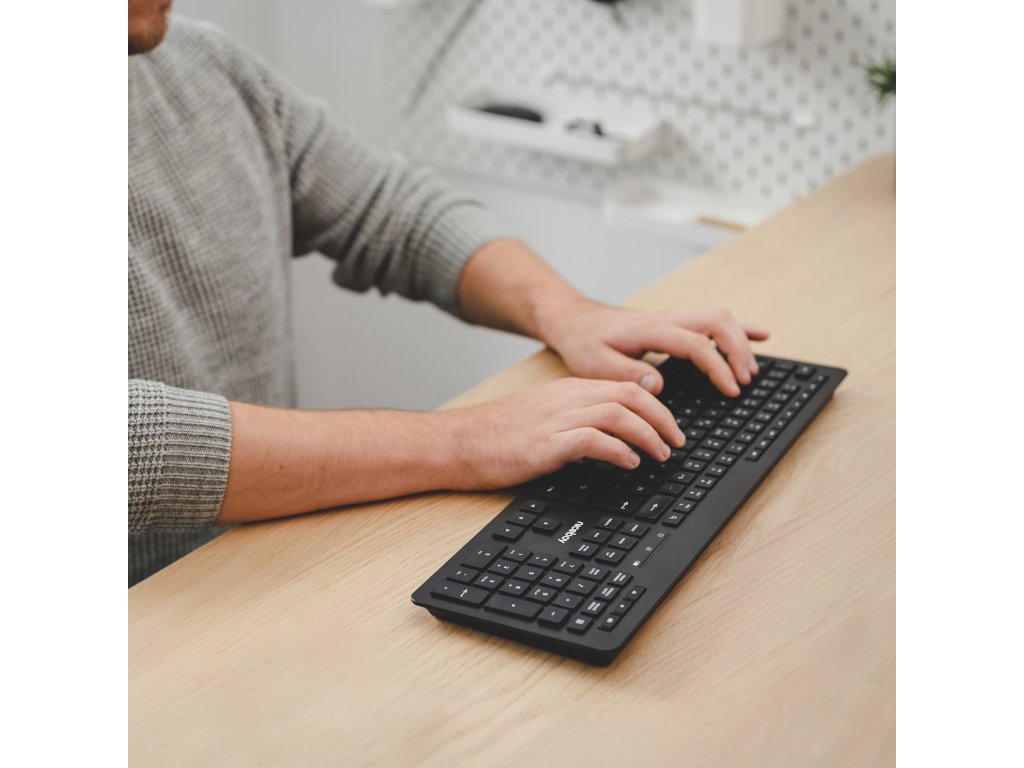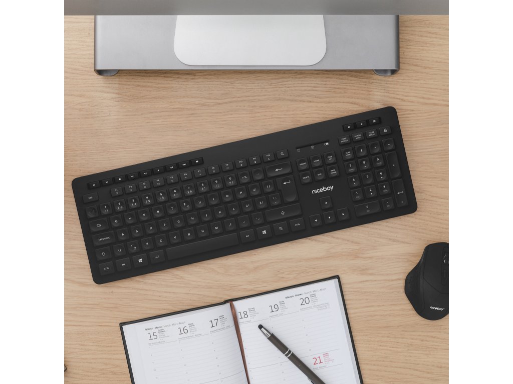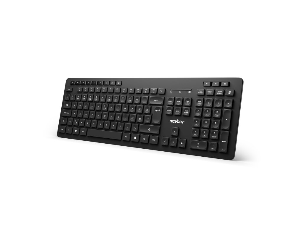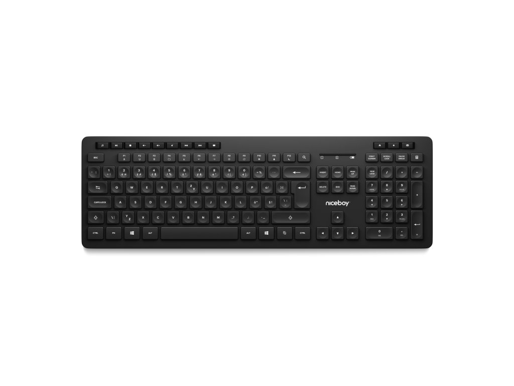 Tenké tělo v elegantním černém provedení je osazeno 121 klávesami ve standardním rozložení. To znamená, že je při psaní najdete přesně tam, kde byste je intuitivně očekávali. Pohodlné používání Niceboy K10 podtrhuje osazení dvanácti multimediálními klávesami pro ovládání videí a hudby jedním dotykem. A další možnosti jako například ovládání prohlížeče nebo e-mailu umožňují sekundární funkce horních kláves F1-F12 v kombinaci s klávesou FN.