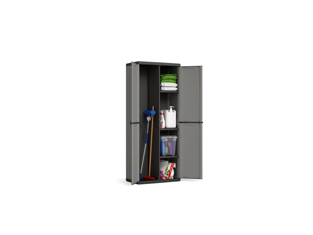 Skříň Keter Jolly Utility přináší promyšlenou kombinaci klasického policového systému a otevřeného prostoru pro větší nářadí nebo třeba smeták. Díky nízké hmotnosti 9,57 kg ji snadno přemístíte, přitom však zůstává stabilní a pevná. Výškově nastavitelné police umožní přizpůsobit si vnitřní uspořádání přesně podle potřeby. Uzamykatelný systém zvyšuje bezpečnost uložených věcí, a skříň tak skvěle poslouží nejen v domácím provozu, ale i na chalupě nebo v technickém zázemí.