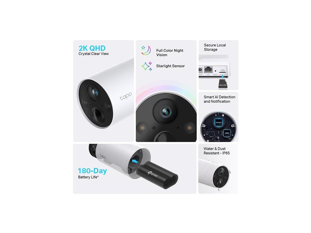 Smart Wire-Free Security Camera, 2 Camera System SPEC: 2 × Tapo C420, 1 × Tapo H200, 2K+(2560x1440), 2.4 GHz, 5200mAh re