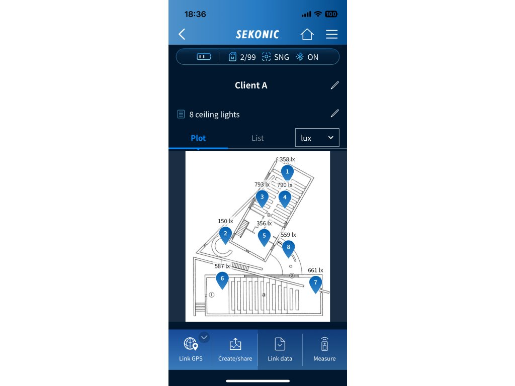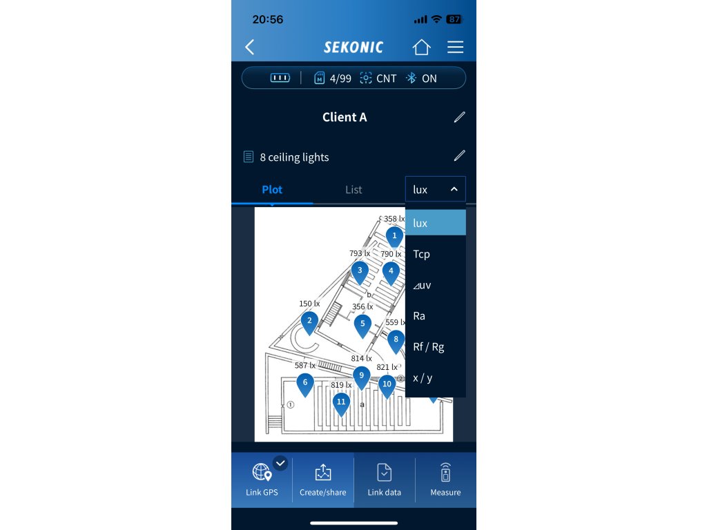 - Zaznamenejte naměřenou hodnotu přímo na výkres nebo obrázek – Naměřené hodnoty lze snadno umístit přímo na importovaný obrázek. Volitelné jednotky pro každý měřený bod mohou být lx, K (Kelvin), uv, Ra, Rf/Rg, x.y.