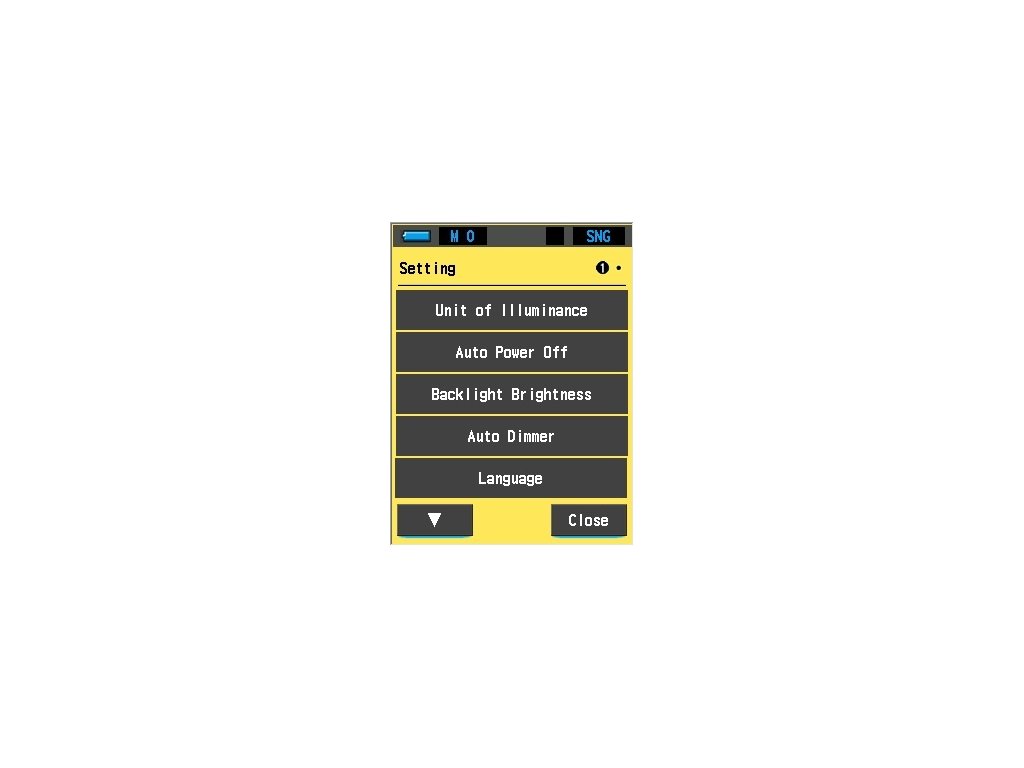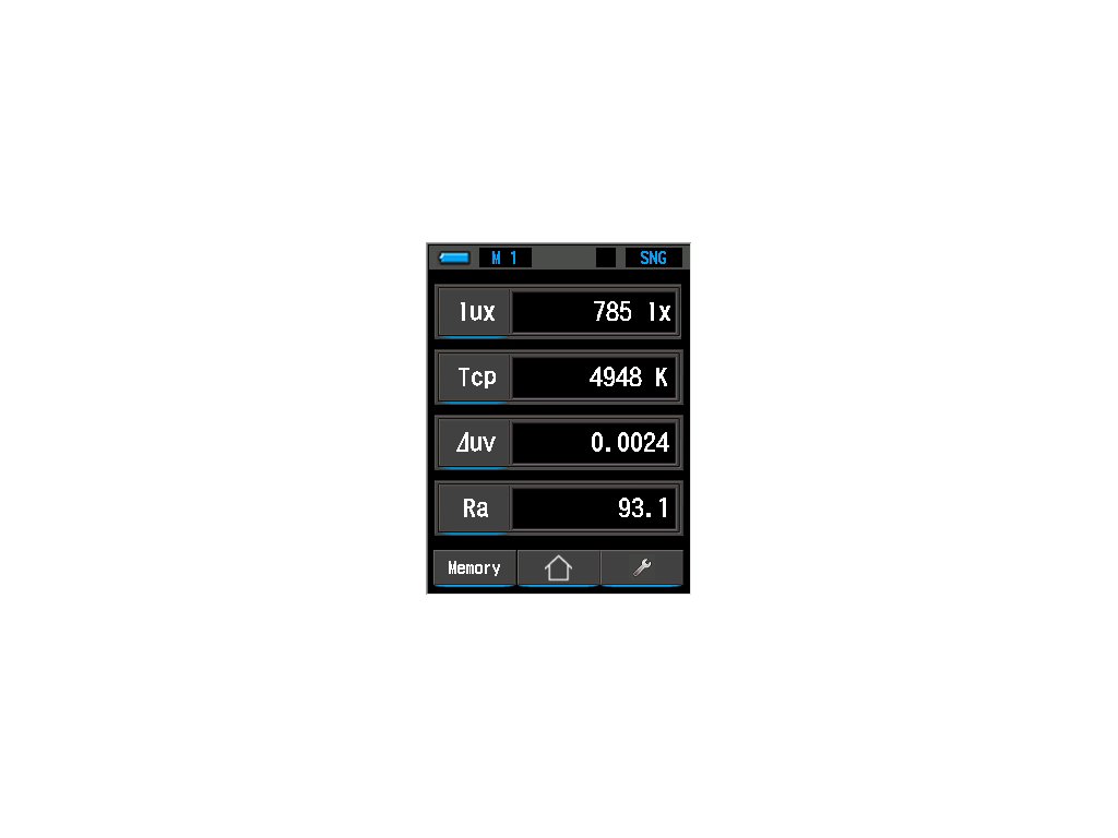 - Hodnota zobrazení: osvětlenost (lx), Tcp (K), uv, CRI (Ra), TM-30 (Rf, Rg), souřadnice chromatičnosti (x, y)