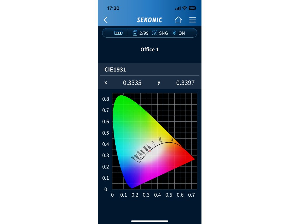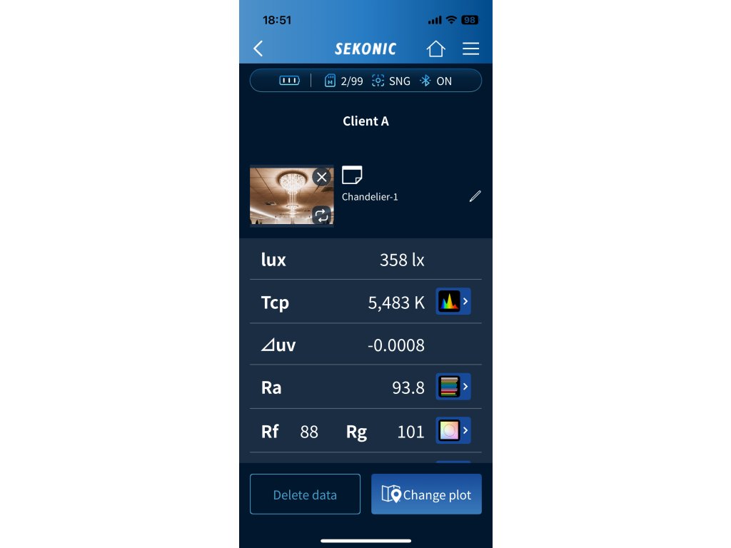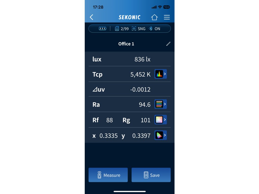 - Zpráva připravená pro aplikaci – Vytvářejte zprávy PDF nebo CSV v aplikaci SEKONIC LD. Zpráva obsahuje polohu GPS, obrázek polohy nebo zachycený výkres se zakreslenými hodnotami, podrobné údaje o měření ve formátu CSV a grafy Spektrum, CRI, TM-30-18 a CIE 1931 pro každý zakreslený zdroj světla.