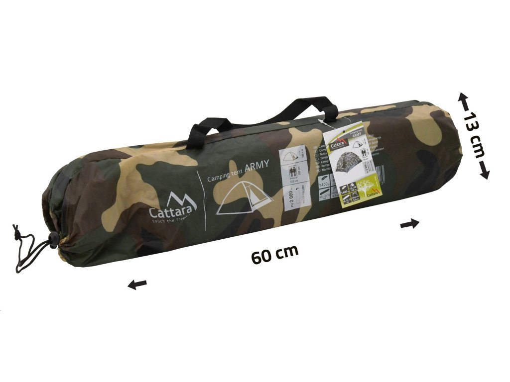 V jednoplášťovém stanu Cattara ARMY s celkovými rozměry 200 x 120 x 100 cm se vyspí 2 osoby. Hlavní vstup je opatřen oboustranným zipem pro snadné otevírání zvenku i zevnitř. Po otevření hlavního vstupu narazíte na síťovanou prodyšnou plentu (moskytiéru), která zamezí vstupu nezvaným hostům, jako jsou komáři, mouchy a jiný hmyz.