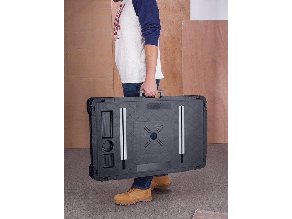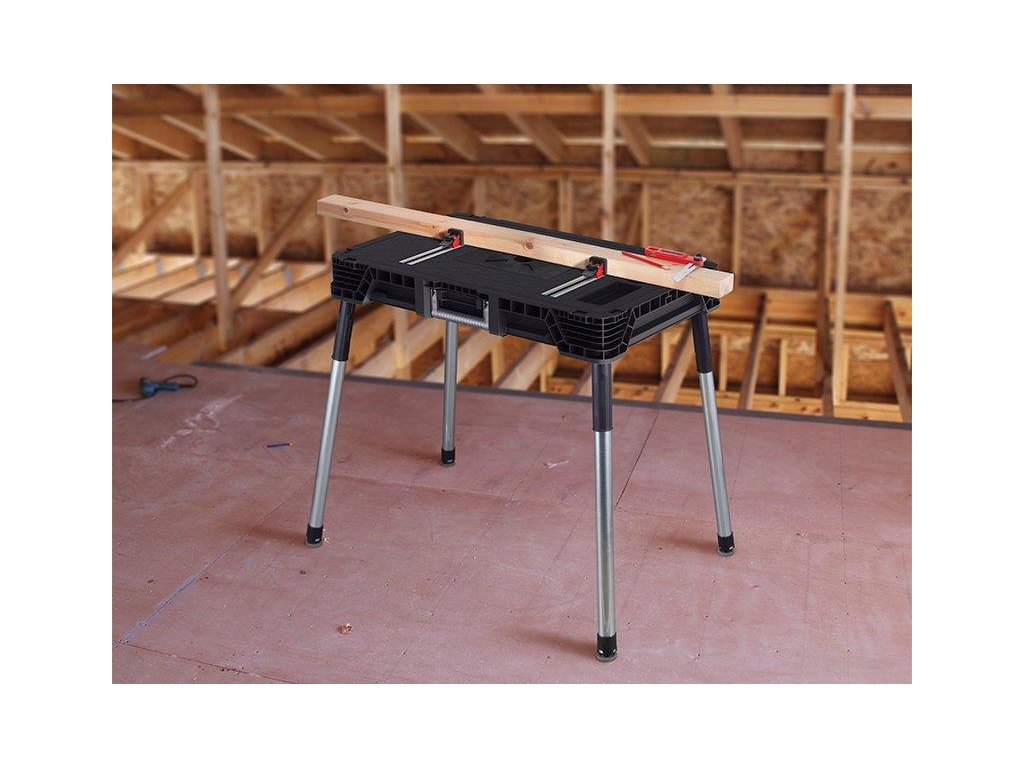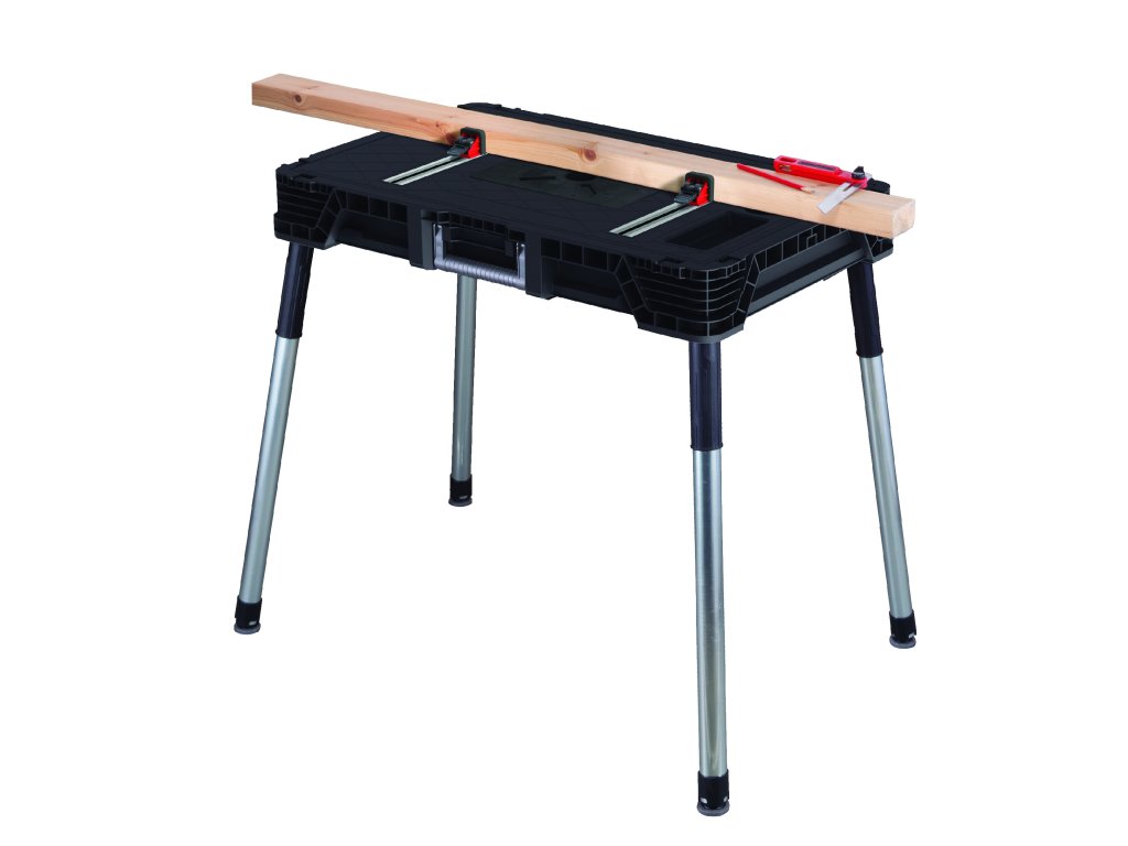 Tento přenosný stůl váží pouze 8,7 kg a přitom nosnost činí 453 kilogramů. Součástí jsou čtyři svorky, univerzální kovové kolejnice ve tvaru T a organizér na nářadí.