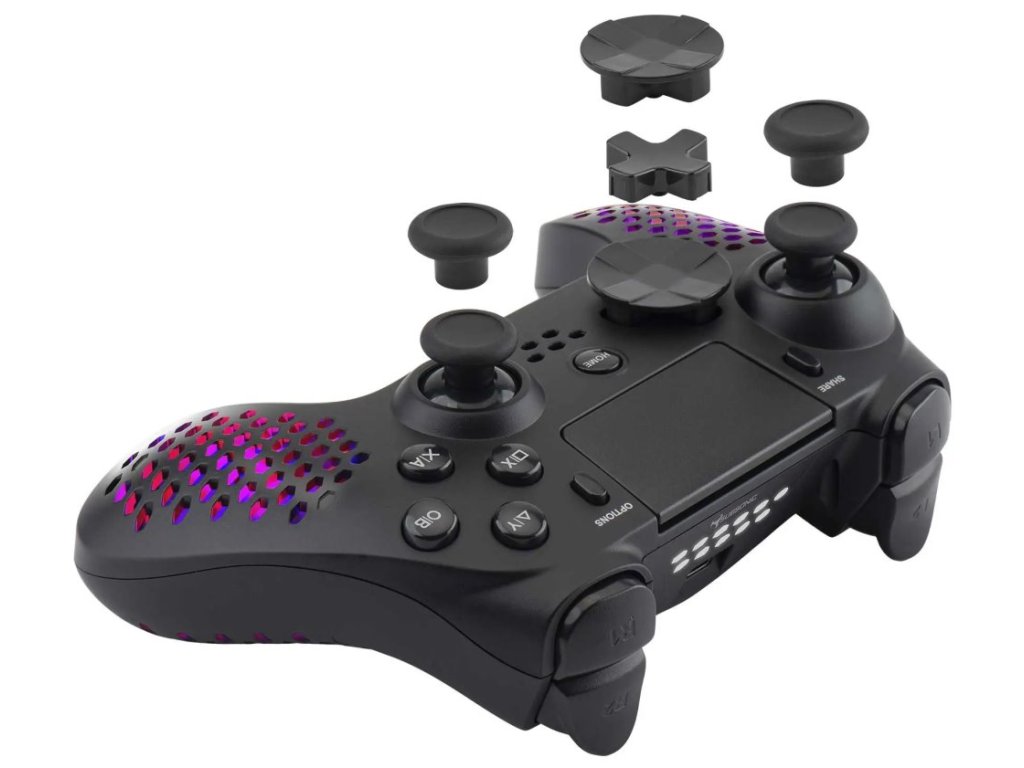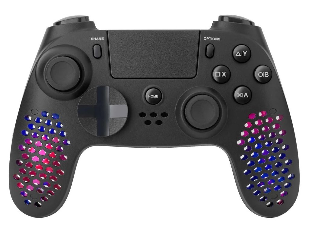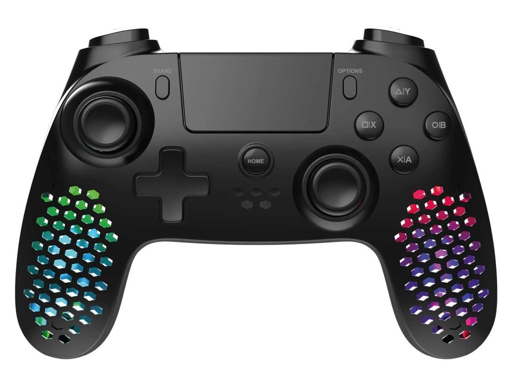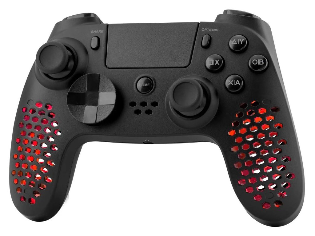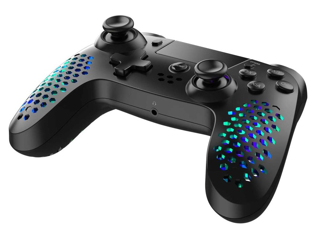 Lehký bezdrátový gamepad založený na technologii Bluetooth podporuje připojení k počítači nebo herní konzoli PS4 a PS3. Díky vibracím nabízí realistický zážitek ze hry. Disponuje přizpůsobitelným joystickem, směrovým D-padem s různými tvary a 17 tlačítky, se kterými budete mít všechny herní funkce vždy na dosah ruky. Jedinečný perforovaný design ovladače skvěle doplňuje nastavitelné RGB podsvícení. K dispozici je navíc také 3,5 mm jack konektor pro připojení sluchátek. Napájení zajišťuje integrovaná baterie, její dobíjení pak přiložený nabíjecí kabel.