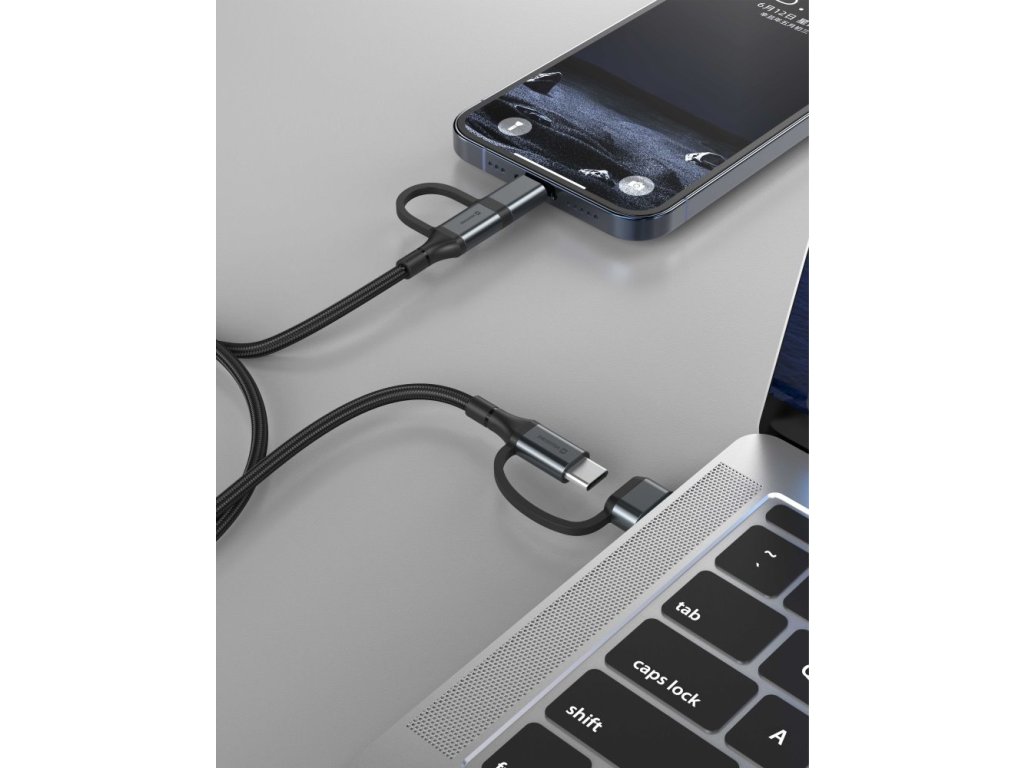Díky čtyřem různým konektorům je tento kabel kompatibilní s většinou moderních zařízení na trhu. Konektory USB / USB-C a USB-C / Lightning umožňují nabíjet a synchronizovat data s telefony a tablety různých výrobců.