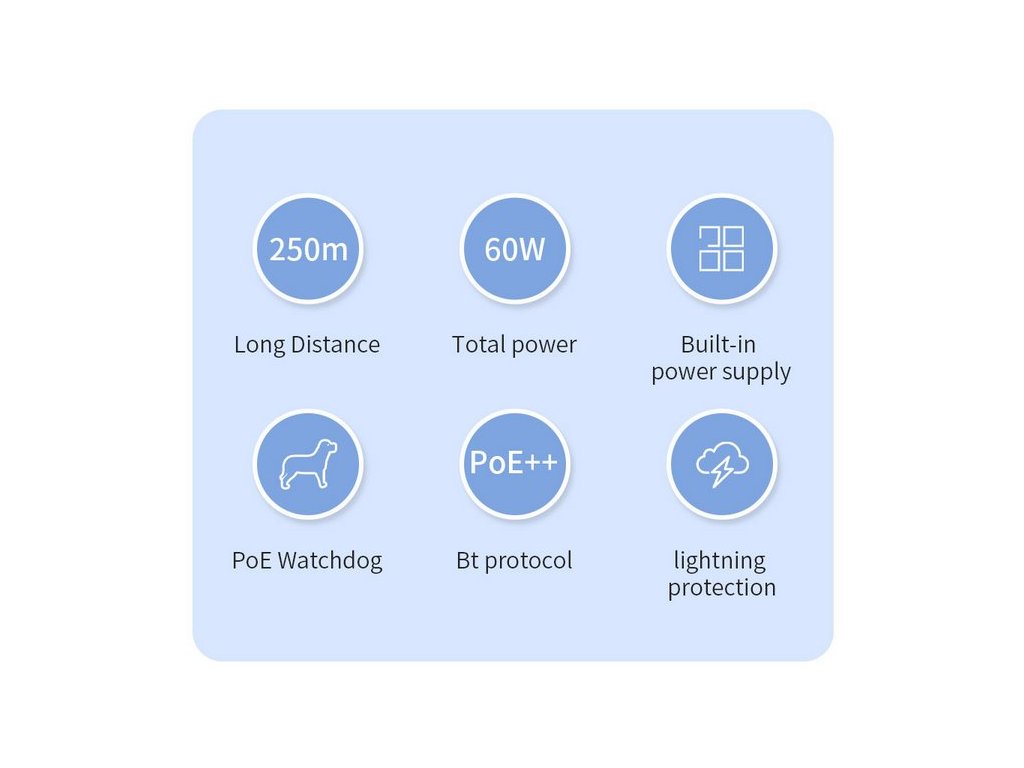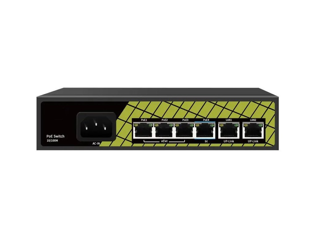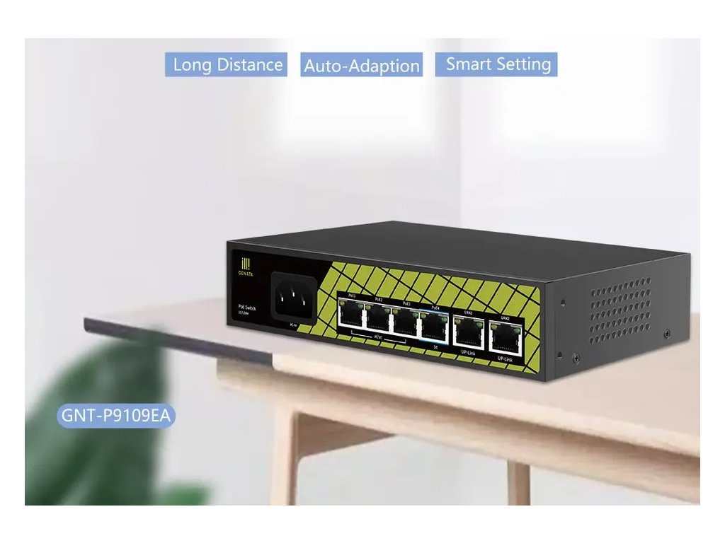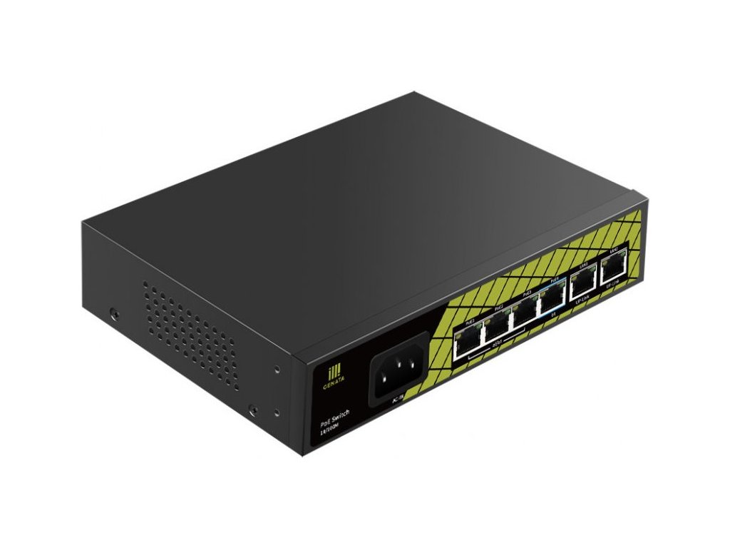 Switch není vybavený ventilátorem, proto má tichý chod. LAN porty vám navíc zajistí přenosovou rychlost 10/100 Mbps. 4 ethernetové porty podporují funkci PoE s celkovým budgetem 60 W (30 W na port, u 4. portu sahá hodnota k 60 W). Napájení probíhá přes AC konektor díky vestavěnému zdroji.