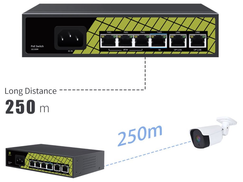 Rychlý ethernetový PoE switch Conexpro je vybavený celkem 6 LAN porty, z toho 2 patří mezi uplink porty. Perfektně se hodí pro použití v domácnostech a rodinných domech. Postará se o napájení až 4 zařízení s nízkou spotřebou – kamery či Wi-Fi přístupové body. Napájí je až na vzdálenost 250 m při snížené linkové rychlosti na 10 Mbps.