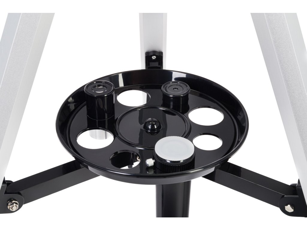 Díky manuálnímu alt-azimutálnímu ovládání je teleskop vhodný i pro začátečníky. Jednoduše ho nasměrujete pomocí vidlice s aretačním knoflíkem na svislé ose. Hliníkový stativ s praktickou přihrádkou na příslušenství umožňuje pohodlné pozorování bez nutnosti držet dalekohled v ruce. Sada obsahuje 3 okuláry s rozdílnými ohniskovými vzdálenostmi, okulár pro vzpřímený obraz, Barlowovu čočku, diagonální zrcátko a další šikovné příslušenství.