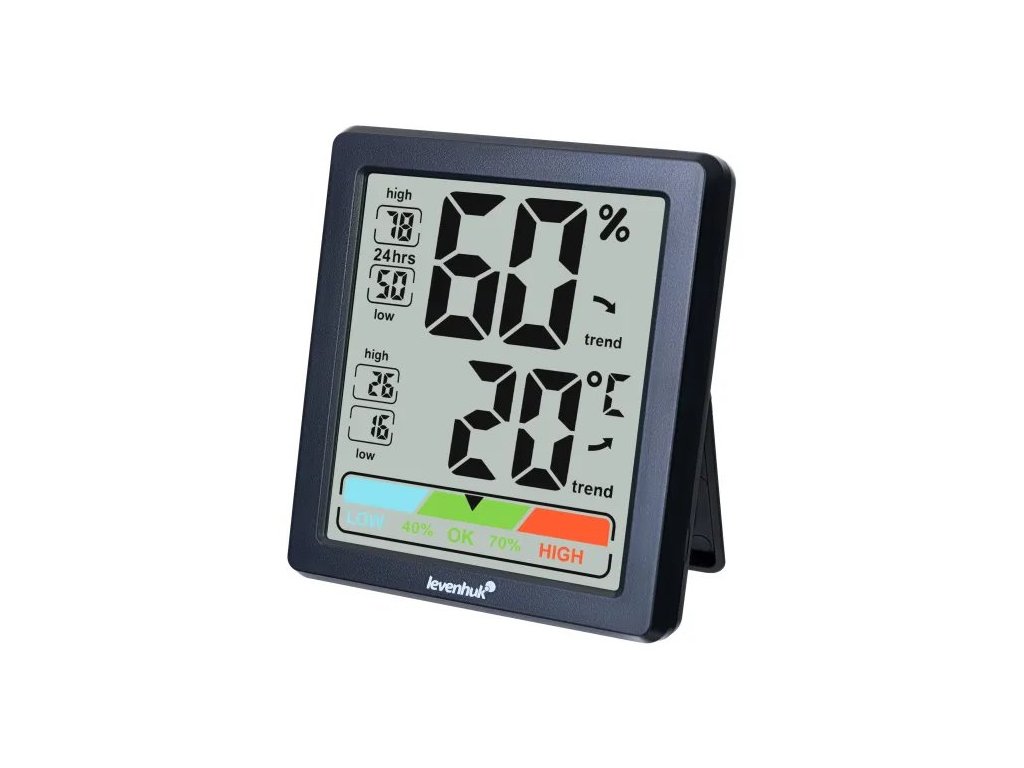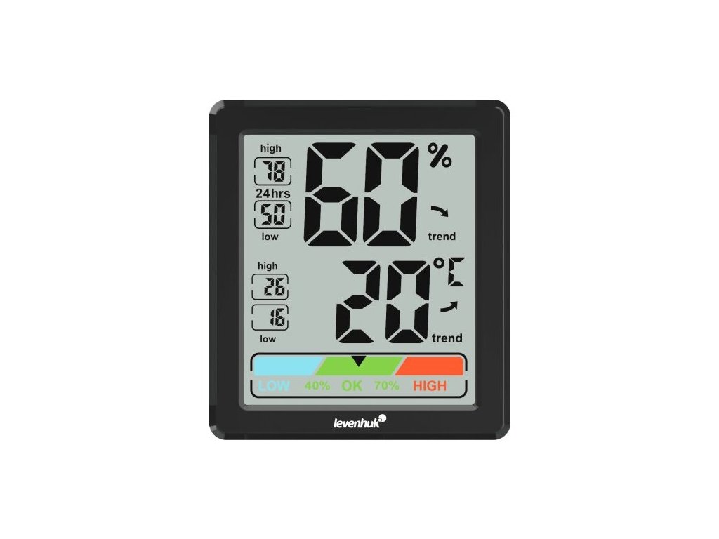 Účinky okolní teploty a vzdušné vlhkosti ovlivňují fyziologické stavy člověka, včetně zdravotní kondice a subjektivních pocitů pohody či nepohody. Levenhuk Wezzer Base L20 je tak vybavený integrovaným displejem, kdy ve spodní části obrazovky se nachází barevná stupnice pro hodnocení úrovně komfortu ve 3 úrovních – LOW (nízká vlhkost, 20 až 39 %), OK (komfortní vlhkost, 40 až 70 %) nebo HIGH (vysoká vlhkost, 71 až 95 %). Lépe tak rozpoznáte tepelný diskomfort při nežádoucím oteplování či ochlazování už v jeho zárodku, díky čemuž si vždy snadno a rychle navodíte pocit pohodlí za každé situace.