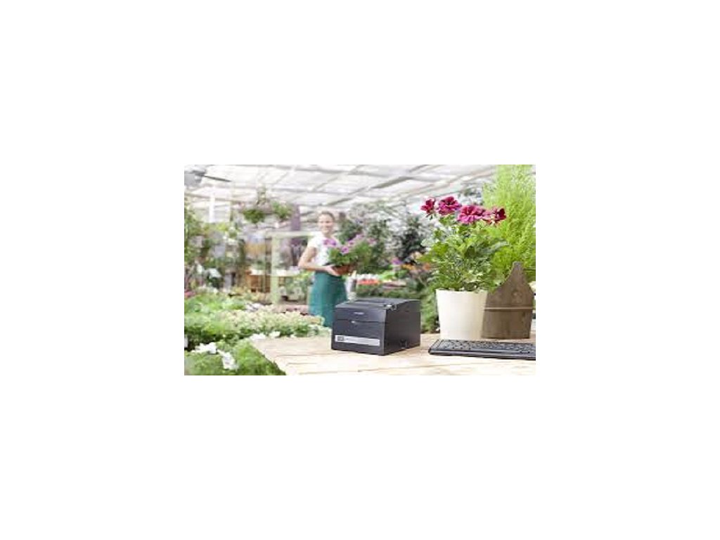 Tiskárna v černém provedení má kompaktní design, je opatřena USB/sériovým portem, interním zdrojem a tichou a rychlou řezačkou papíru.