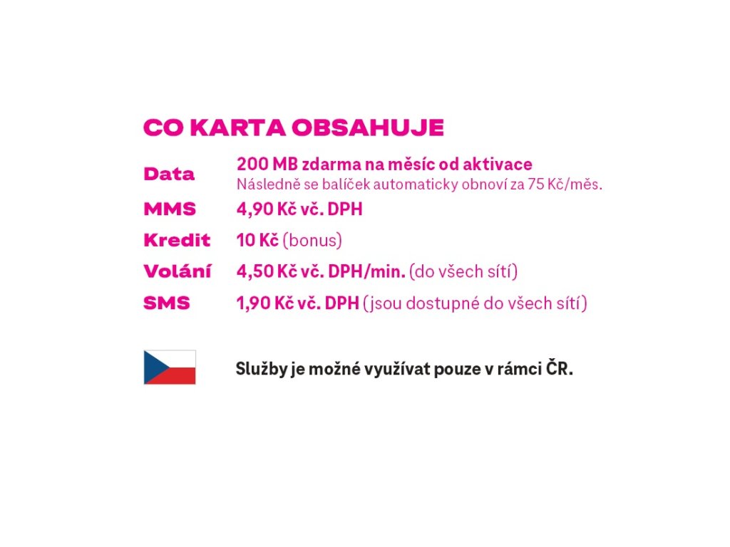200 MB zdarma na měsíc od aktivace, následně se balíček ,automaticky obnoví za 75 Kč/měs. bonusový kredit 150 Kč volání 4,50 Kč/min. (do všech sítí) SMS 1,90 Kč (do všech sítí) MMS 4,90 Kč Ceny jsou uvedeny včetně DPH.