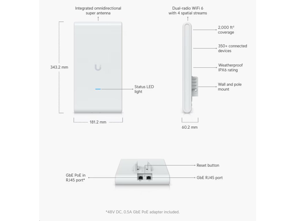 Vnitřní/venkovní WiFi 6 AP se 4 prostorovými streamy, integrovanou super anténou a gigabitovým průchozím portem.
