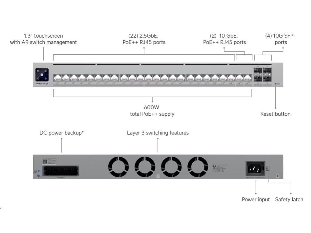 Ubiquiti Professional-grade, Layer 3 Etherlighting™ switch with (2) 10 GbE PoE++, (22) 2.5 GbE PoE++, and (4) 10G SFP+ p