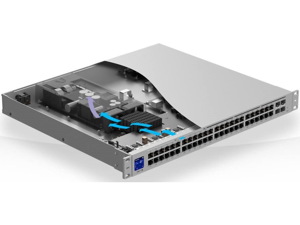 - Pro případ výpadku napájení nebo poruchy interního zdroje je možné switch připojit k záložnímu systému UniFi SmartPower, který obslouží až 6 podporovaných zařízení