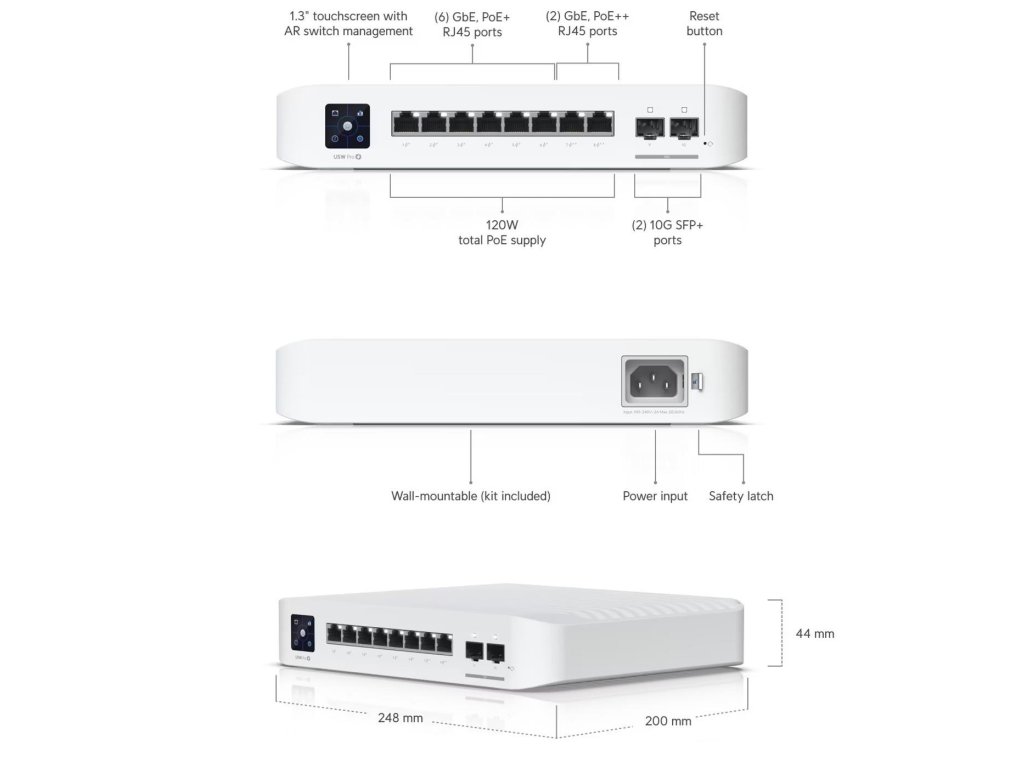 Ubiquiti USW-Pro-8-PoE je novým switchem, který nabízí až 6 POE/POE+ portů, schopných dodávat až 30 W, a také 2 POE++ porty, které dokážou dodávat až 60 W. Celkový maximální výstupní výkon je 120 W. Switch má 2 SFP+ porty s rychlostí až 10 Gb/s, což je ideální pro přenos i větších souborů. Na přední straně switche najdete dotykový ovládací panel i s AR nastavením. Switch lze také upevnit na zeď pomocí příslušného držáku.