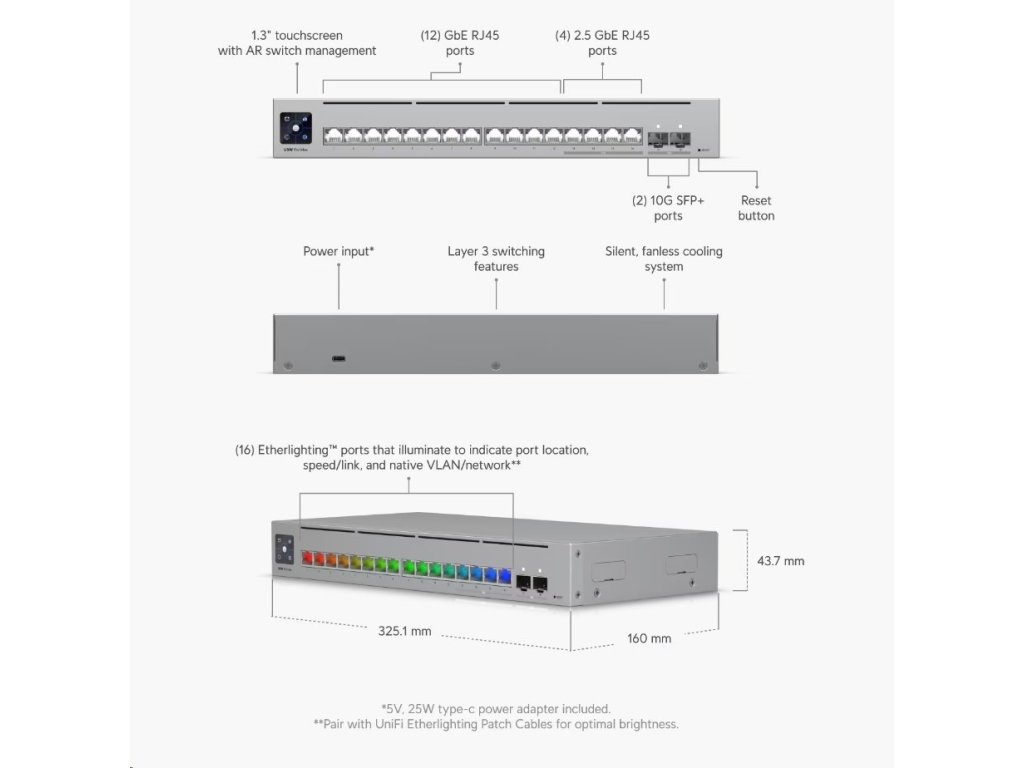 Ubiquiti Pro Max 16 je novým L3 switchem, který nabízí 4x 2.5 Gbps a 12x 1 Gbps porty. Pro připojení pomocí optického rozhraní jsou připraveny 2 SFP+ porty dosahující rychlosti až 10 Gb/s. Switch je napájen přes USB-C konektor 5V DC 25W.