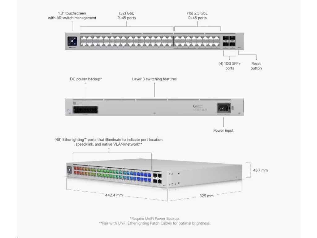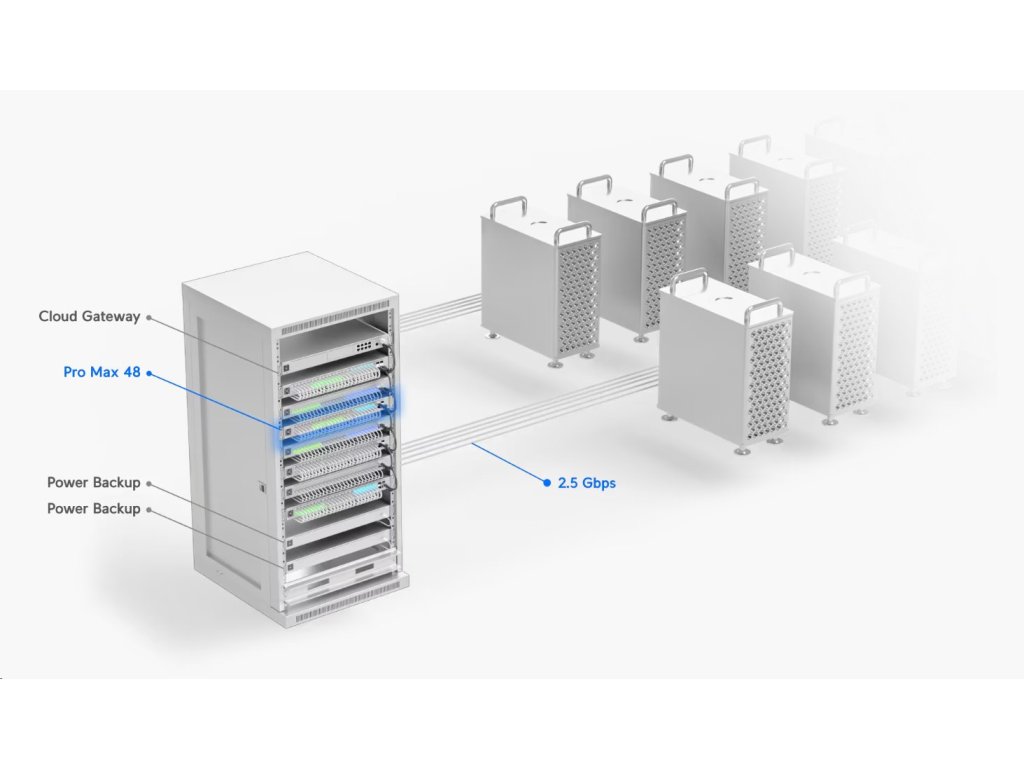 Ubiquiti USW Pro Max 48 je kvalitní switch. K dispozici má 16 LAN portů s rychlostí až 2,5 Gb/s. Ostatních 32 portů má rychlost 1 Gb/s. K dispozici jsou také 4 SFP+ porty o rychlosti až 10 Gb/s. Switch lze nastavit pomocí UniFi Controlleru. Je vybaven také dotykovým displejem s ovládacími prvky. Na zadní straně, kromě běžného napájení, najdeme i záložní DC napájení, které se využije například při výpadku proudu.