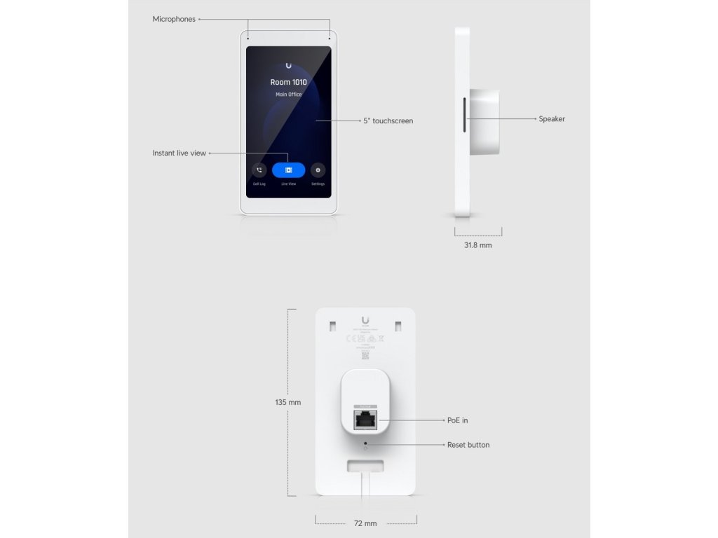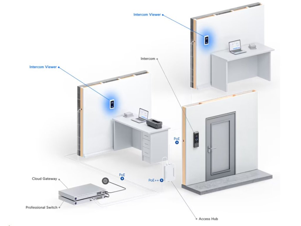 UA-Intercom-Viewer doplňuje řadu Unifi Access, a po propojení s UA-Intercom slouží ke komunikaci s osobu u interkomu vně uzavřených prostor a případnému umožnění vstupu. Kompaktní a elegantní video telefon je navržen pro maximální uživatelský komfort a spolehlivost. Do sítě se připojuje prostřednictvím ethernetového portu. skrze který se také napájí (48V DC pasivní POE).