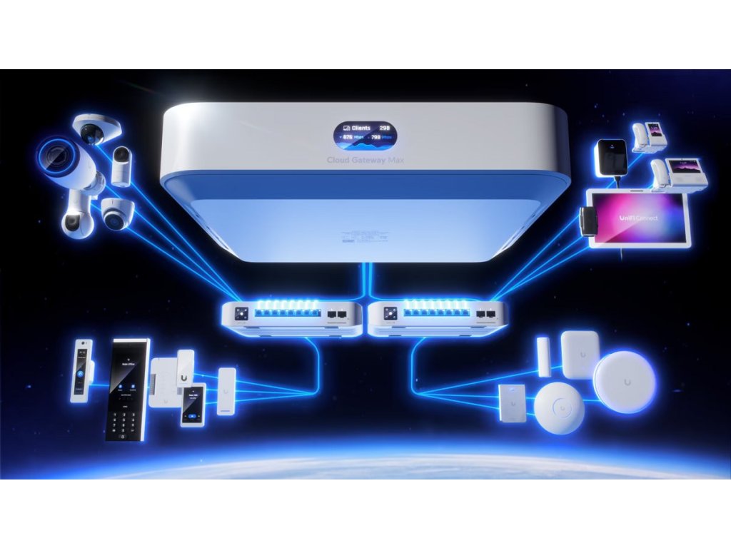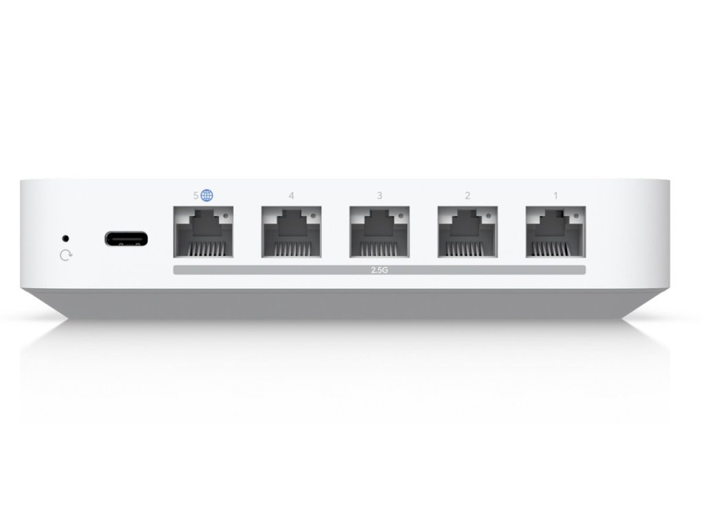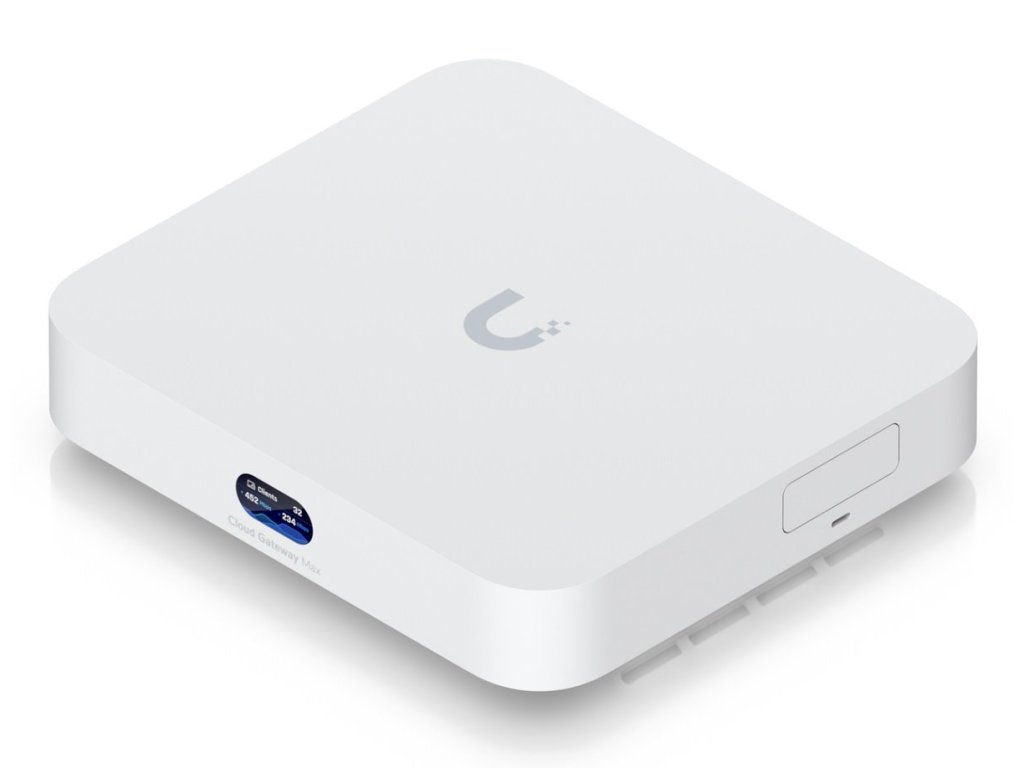 UCG-Max je všestranné zařízení ze série UniFi Cloud Gateway. Router disponuje (1) WAN 1/2.5Gbps portem a (4) LAN 1/2.5Gbps porty (1 s možností konfigurace LAN/WAN). Kompaktní, ale výkonné provedení tak podporuje funkci multi-WAN včetně možnosti load balancing, nechybí podpora IDS/IPS. Router má implementovanou podporu různých typů VPN, včetně site-to-site VPN.