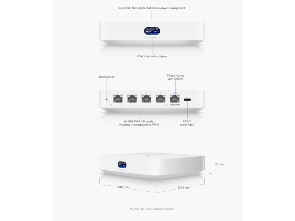 Pomocí integrované aplikace UniFi Network dokážete spravovat až 30+ UniFi zařízení a obsloužit až 300+ připojených klientských zařízení. Nechybí stavový displej o velikosti 0,96". Napájení je řešeno prostřednictvím USB-C konektoru, napájecí adaptér je součástí balení.