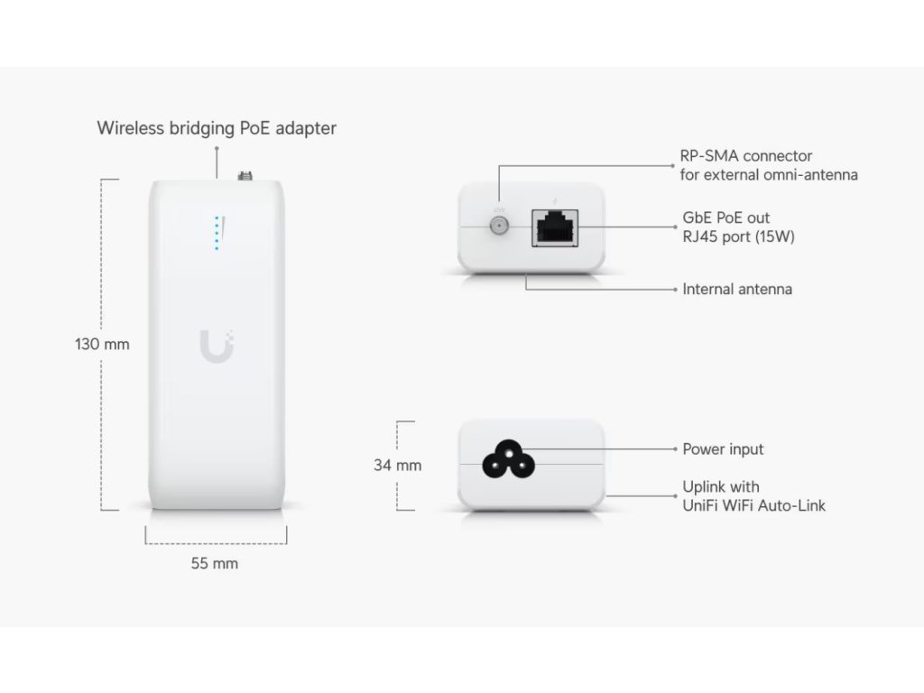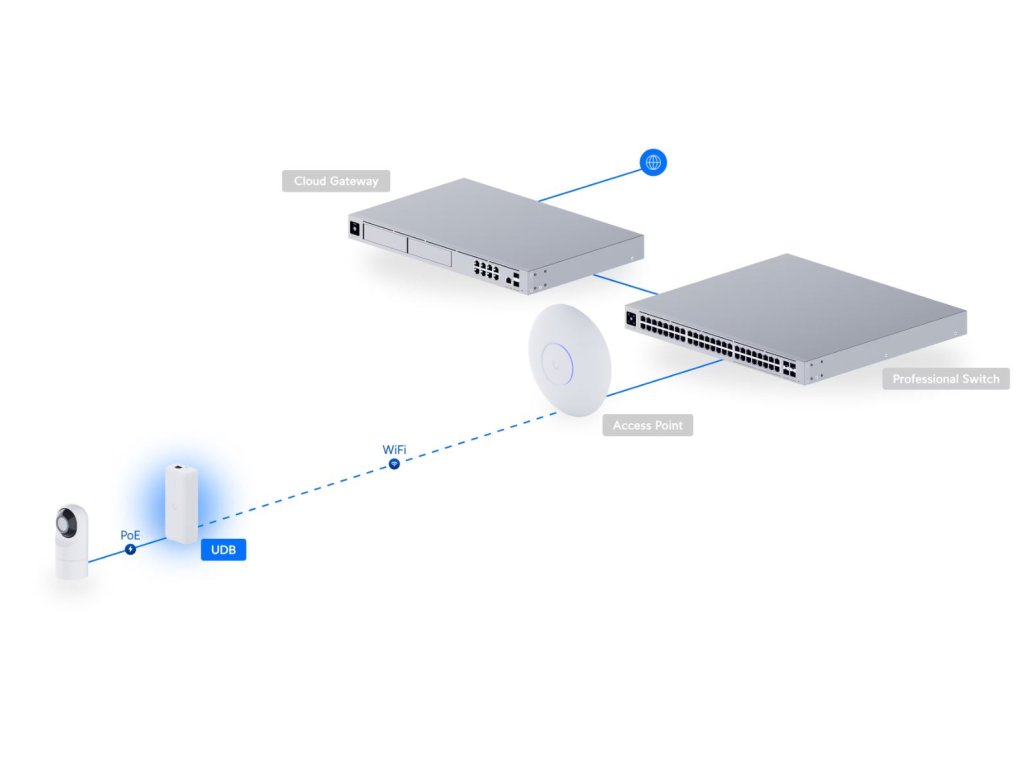 Tento plug-and-play 5 GHz bezdrátový bridge umožňuje point-to-point připojení k jinému UDB zařízení na krátké vzdálenosti až několika stovek metrů. Disponuje jedním GbE RJ-45 PoE-Out portem pro napájení jiného zařízení, jako jsou kamery a další. Samotné zařízení je napájeno kabelem ze sítě.